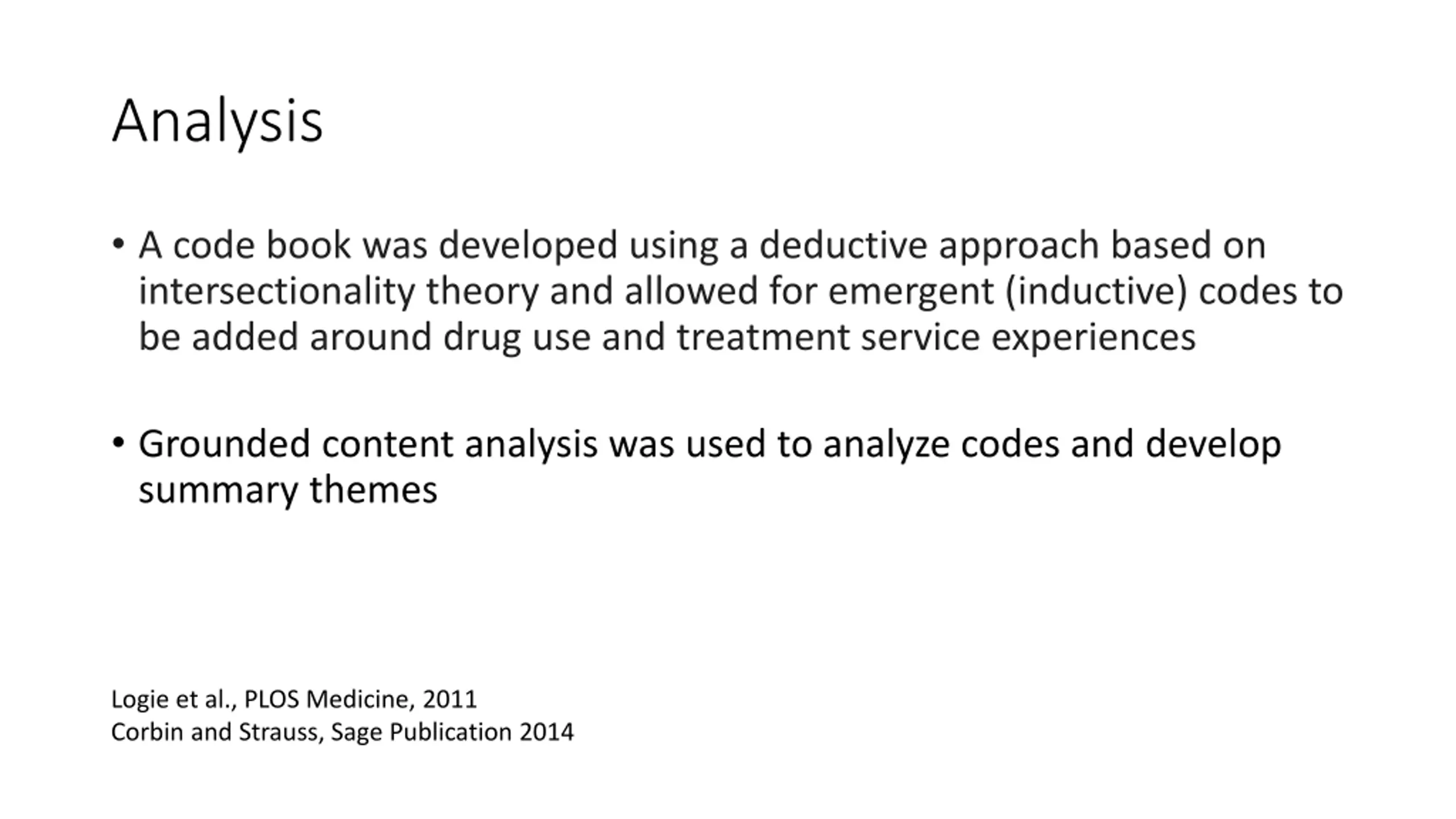 Analysis A code book was developed using a deductive approach based on intersectionality theory and allowed for emergent (inductive) codes to be added around drug use and treatment service experiences Grounded content analysis was used to analyze codes and develop summary themes Logie et al., PLOS Medicine, 2011 Corbin and Strauss, Sage Publication 2014