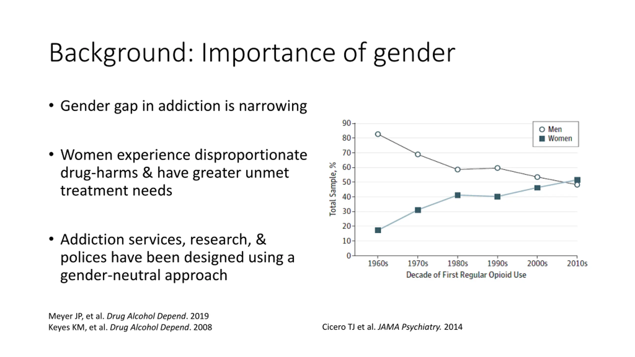 Background: Importance of gender Gender gap in addiction is narrowing Women experience disproportionate drug-harms & have greater unmet treatment needs Addiction services, research, & polices have been designed using a gender-neutral approach Meyer JP, et al. Drug Alcohol Depend. 2019 Keyes KM, et al. Drug Alcohol Depend. 2008 Cicero TJ et al. JAMA Psychiatry. 2014