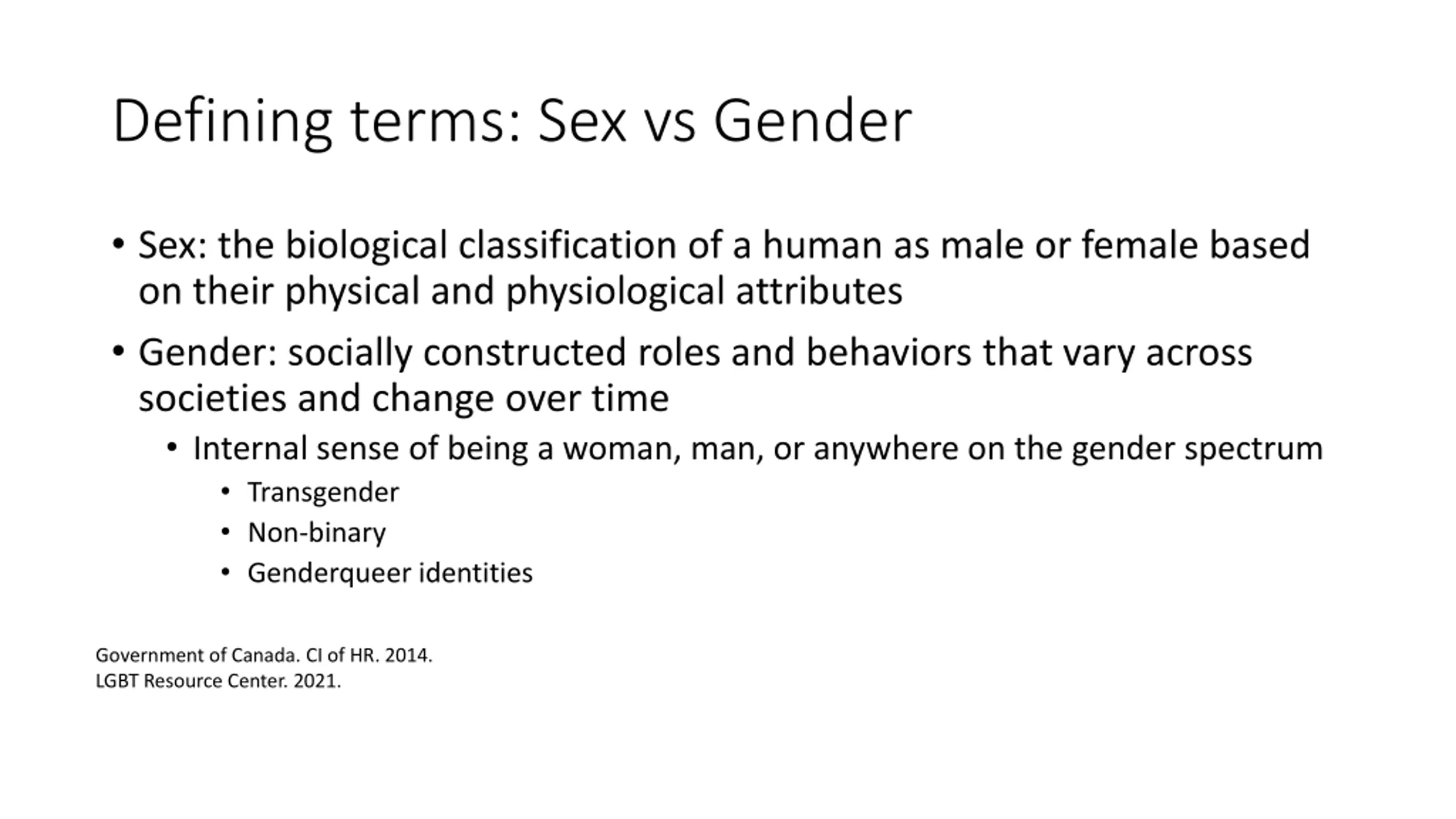 Defining terms: Sex vs Gender Sex: the biological classification of a human as male or female based on their physical and physiological attributes Gender: socially constructed roles and behaviors that vary across societies and change over time Internal sense of being a woman, man, or anywhere on the gender spectrum Transgender Non-binary Genderqueer identities Government of Canada. CI of HR. 2014. LGBT Resource Center. 2021.