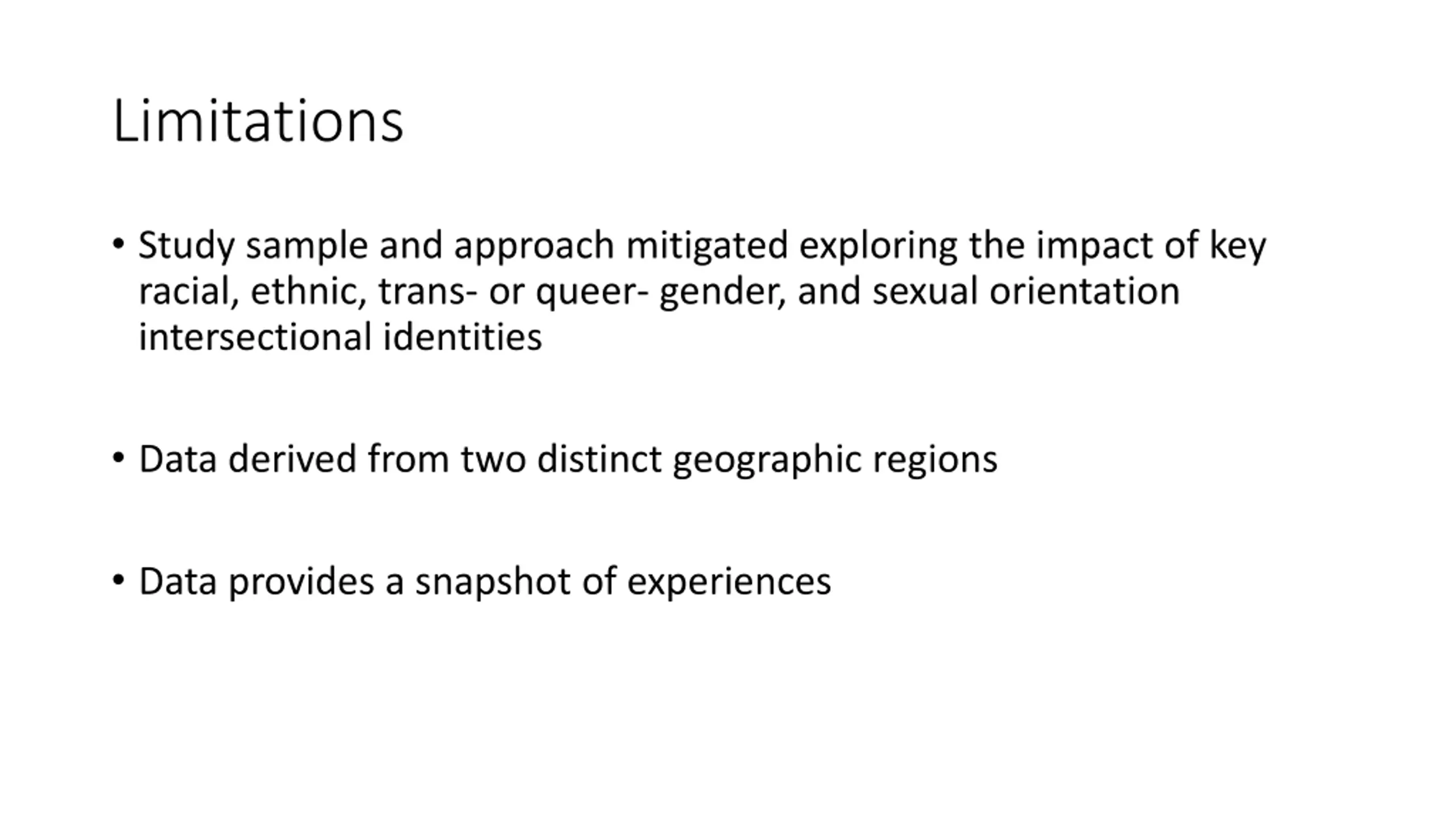 Limitations Study sample and approach mitigated exploring the impact of key racial, ethnic, trans- or queer- gender, and sexual orientation intersectional identities Data derived from two distinct geographic regions Data provides a snapshot of experiences