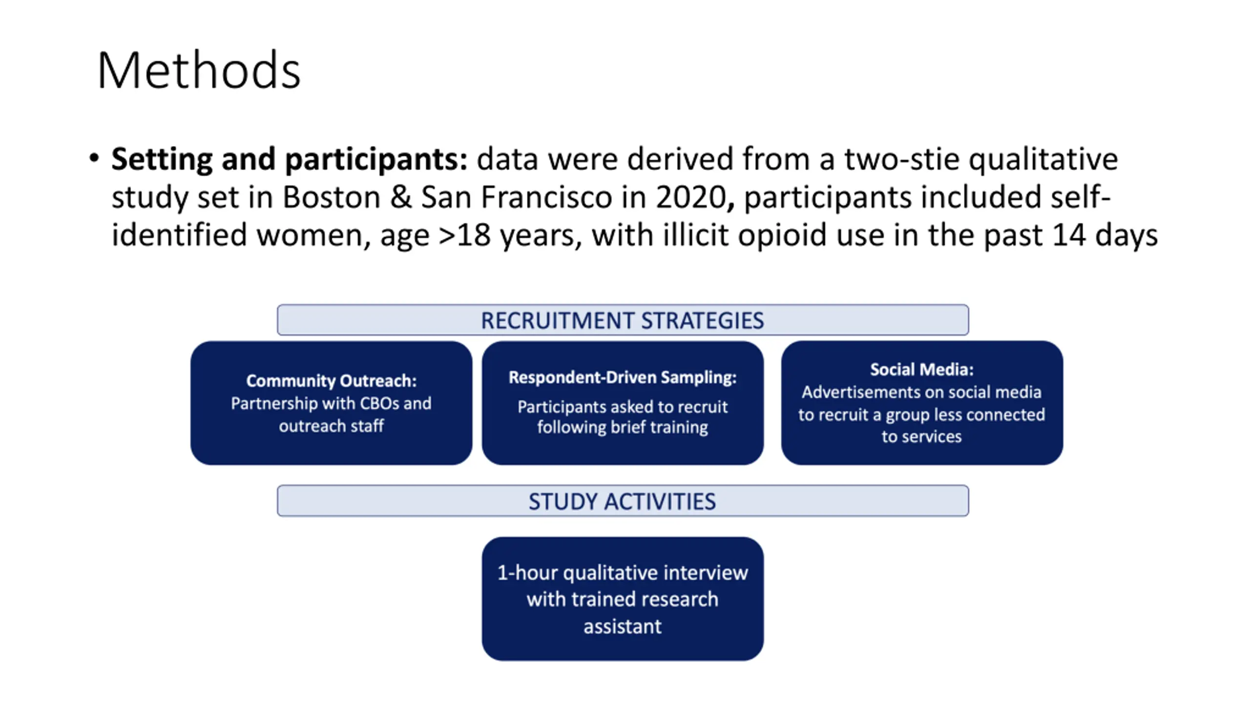 Methods Setting and participants: data were derived from a two-stie qualitative studyset in Boston & San Francisco in 2020, participants included self- identified women, age >18 years, with illicit opioid use in the past 14 days