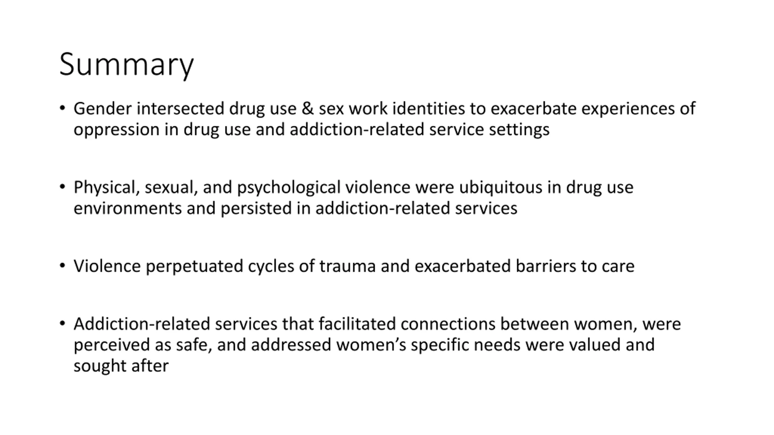 Summary Gender intersected drug use & sex work identities to exacerbate experiences of oppression in drug use and addiction-related service settings Physical, sexual, and psychological violence were ubiquitous in drug use environments and persisted in addiction-related services Violence perpetuated cycles of trauma and exacerbated barriers to care Addiction-related services that facilitated connections between women, were perceived as safe, and addressed women s specific needs were valued and sought after