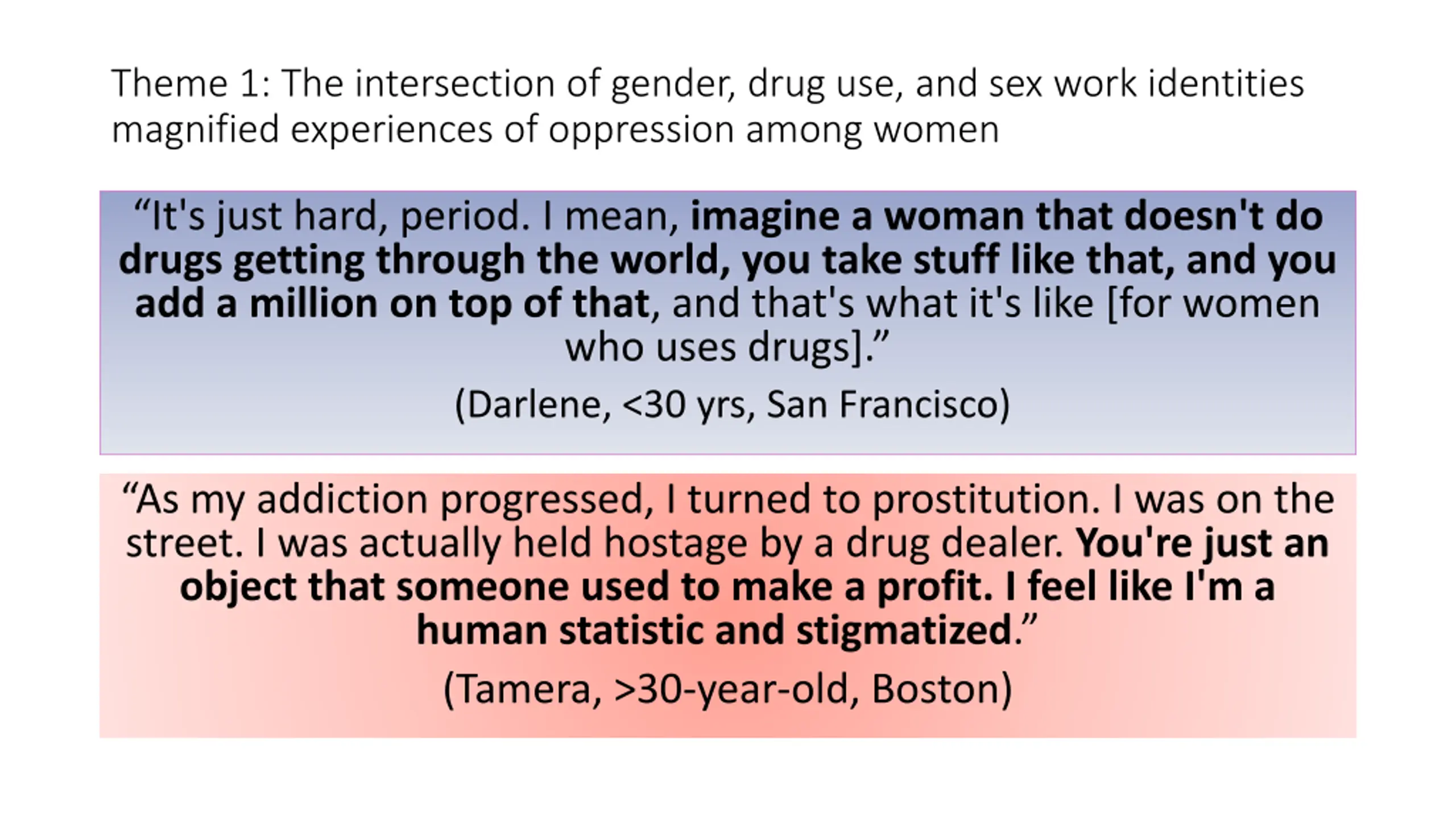 Theme 1: The intersection of gender, drug use, and sex work identities magnified experiences of oppression among women It's just hard, period. I mean, imagine a woman that doesn't do drugs getting through the world, you take stuff like that, and you add a million on top of that, and that's what it's like [for women who uses drugs]. (Darlene, <30 yrs, San Francisco) As my addiction progressed, I turned to prostitution. I was on the street. I was actually held hostage by a drug dealer. You're just an object that someone used to make a profit. I feel like I'm a human statistic and stigmatized. (Tamera, >30-year-old, Boston)