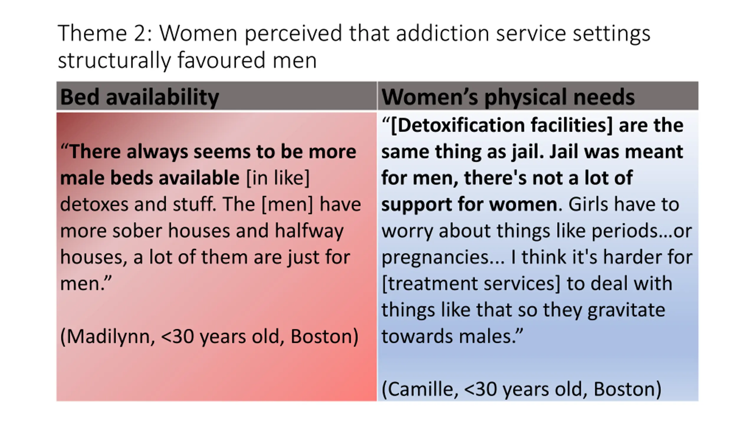 Theme 2: Women perceived that addiction service settings structurally favoured men Bed availability Women s physical needs [Detoxification facilities] are the same thing as jail. Jail was meant for men, there's not a lot of support for women. Girls have to worry about things like periods or pregnancies... I think it's harder for [treatment services] to deal with things like that so they gravitate towards males. There always seems to be more male beds available [in like] detoxes and stuff. The [men] have more sober houses and halfway houses, a lot of them are just for men. (Madilynn, <30 years old, Boston) (Camille, <30 years old, Boston)
