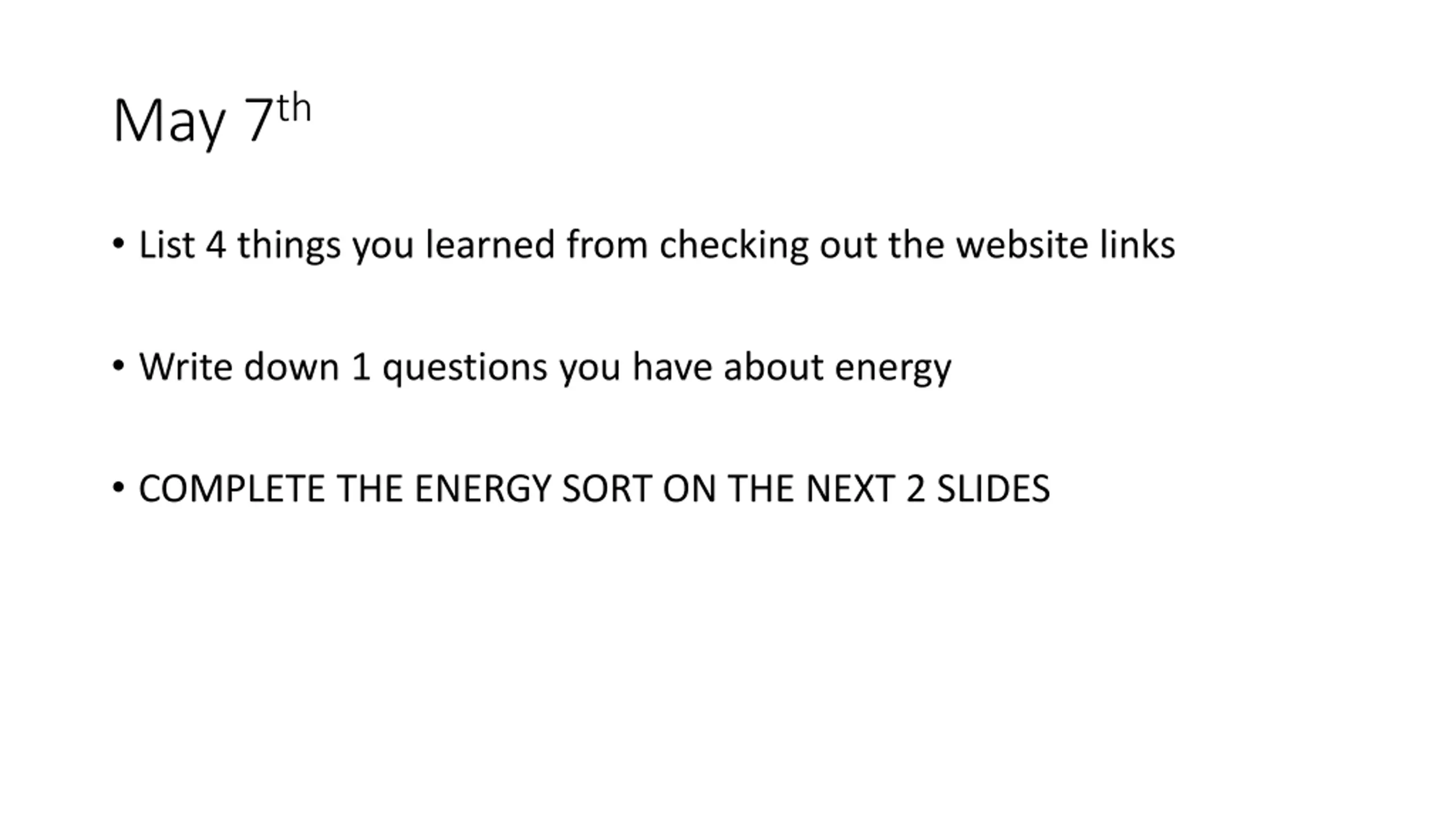 May 7th List 4 things you learned from checking out the website links Write down 1 questions you have about energy COMPLETE THE ENERGY SORT ON THE NEXT 2 SLIDES