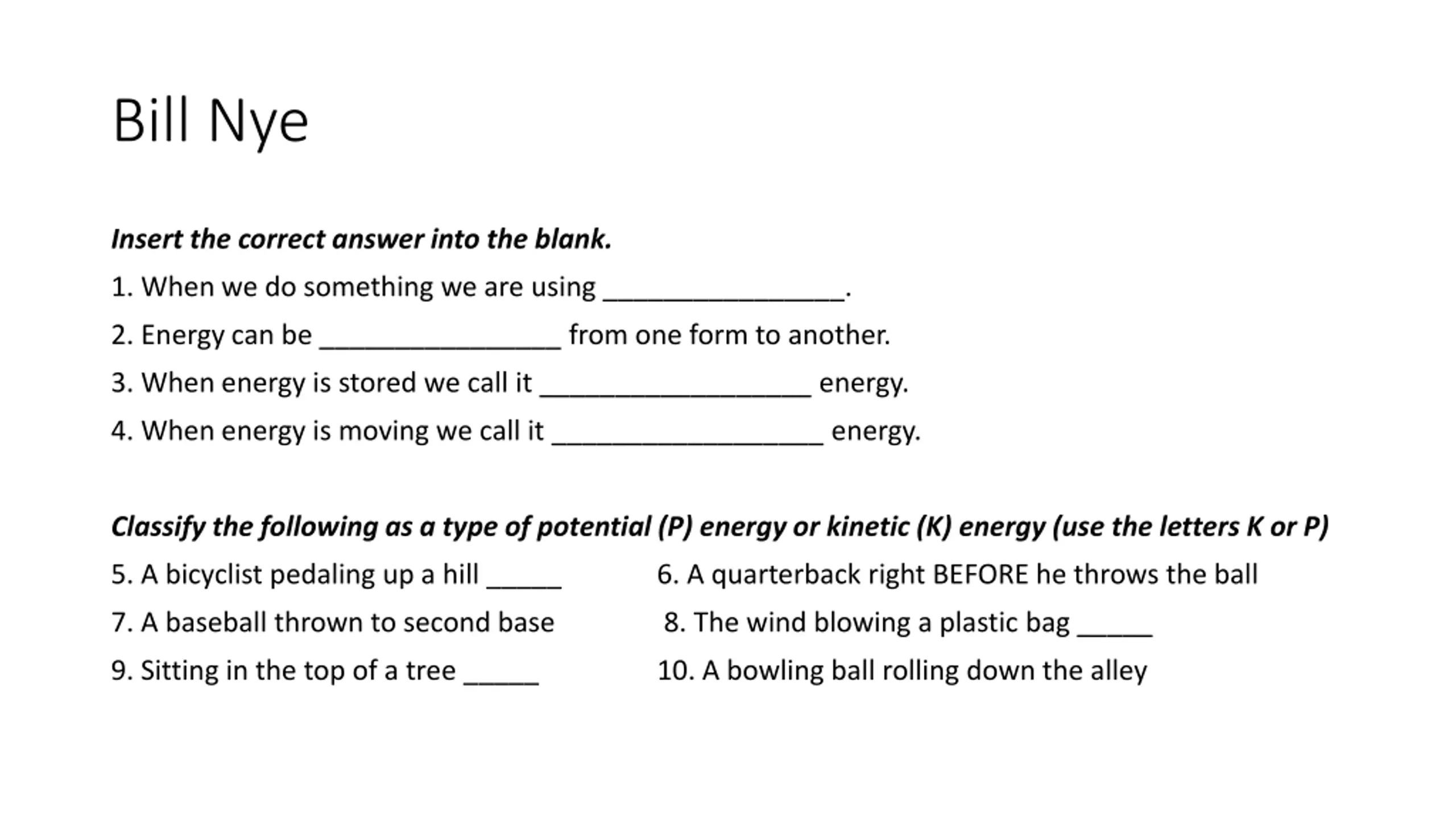 Bill Nye Insert the correct answer into the blank. 1. When we do something we are using ________________. 2. Energy can be ________________ from one form to another. 3. When energy is stored we call it __________________ energy. 4. When energy is moving we call it __________________ energy. Classify the following as a type of potential (P) energy or kinetic (K) energy (use the letters K or P) 5. A bicyclist pedaling up a hill _____ 6. A quarterback right BEFORE he throws the ball 7. A baseball thrown to second base 8. The wind blowing a plastic bag _____ 9. Sitting in the top of a tree _____ 10. A bowling ball rolling down the alley