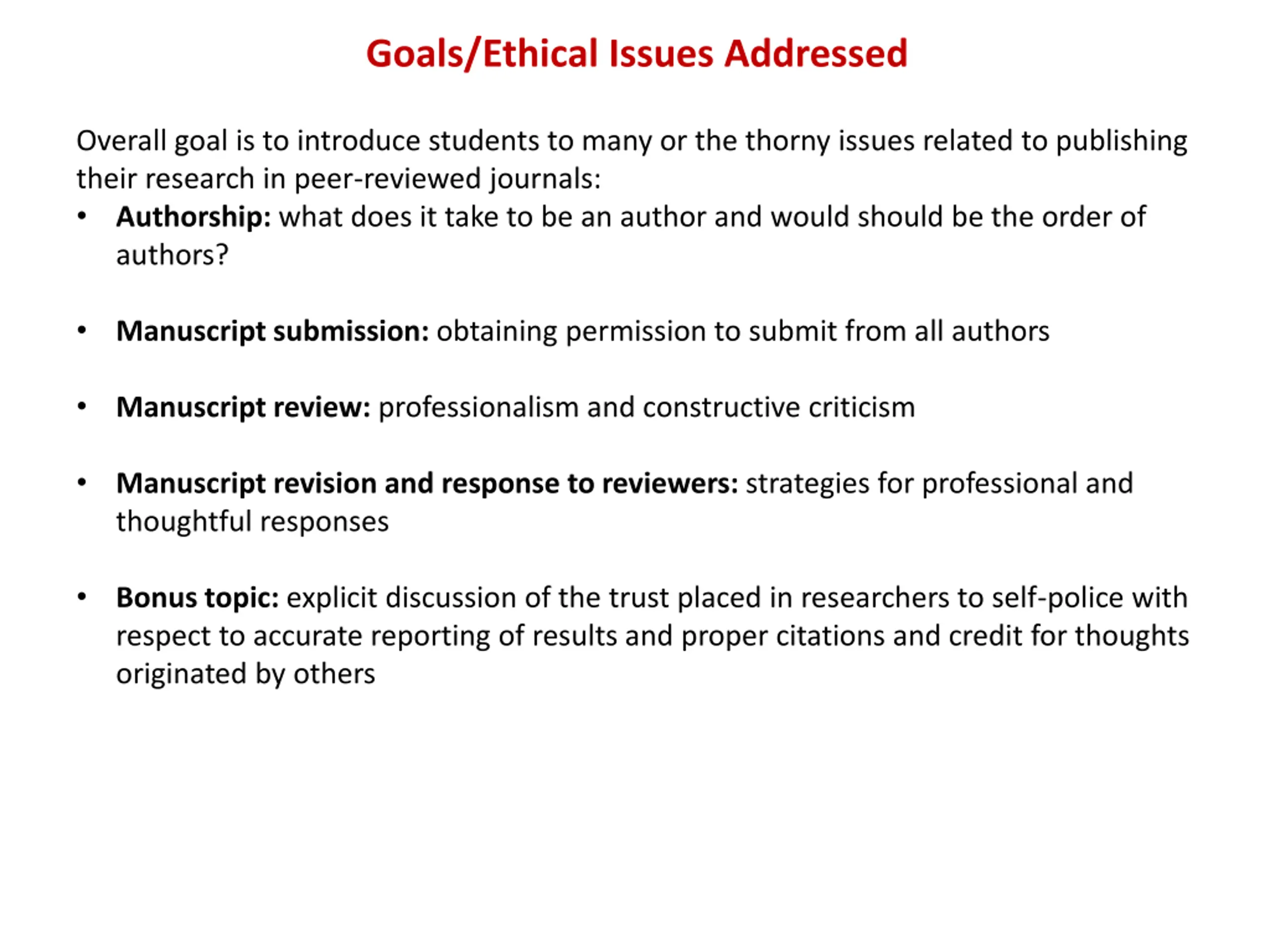 - Goals/Ethical Issues Addressed Overall goal is to introduce students to many or the thorny issues related to publishing their research in peer-reviewed journals: Authorship: what does it take to be an author and would should be the order of authors? Manuscript submission: obtaining permission to submit from all authors Manuscript review: professionalism and constructive criticism Manuscript revision and response to reviewers: strategies for professional and thoughtful responses Bonus topic: explicit discussion of the trust placed in researchers to self-police with respect to accurate reporting of results and proper citations and credit for thoughts originated by others