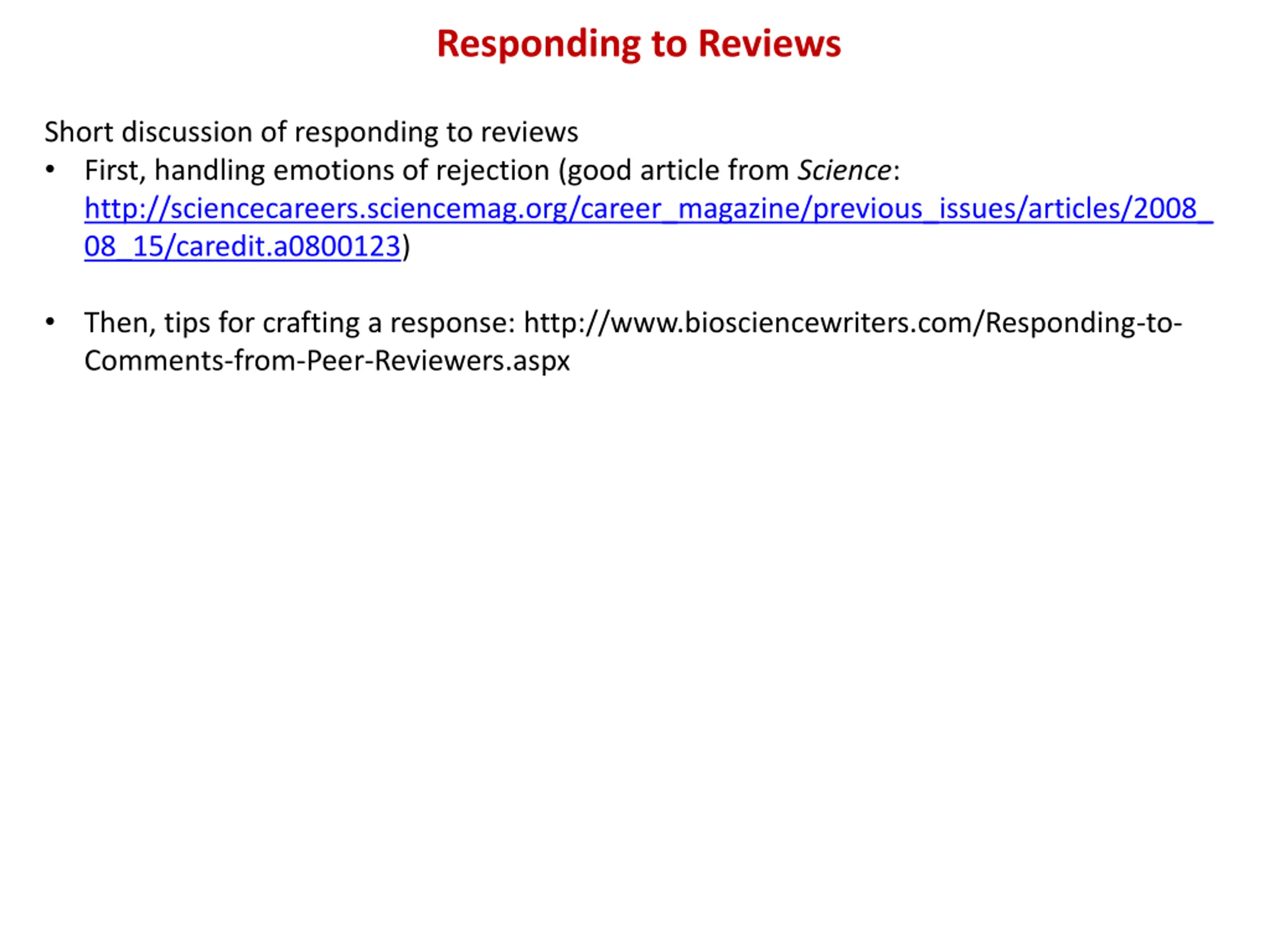 - Responding to Reviews Short discussion of responding to reviews First, handling emotions of rejection (good article from Science: http://sciencecareers.sciencemag.org/career_magazine/previous_issues/articles/2008_ 08_15/caredit.a0800123) Then, tips for crafting a response: http://www.biosciencewriters.com/Responding-to- Comments-from-Peer-Reviewers.aspx