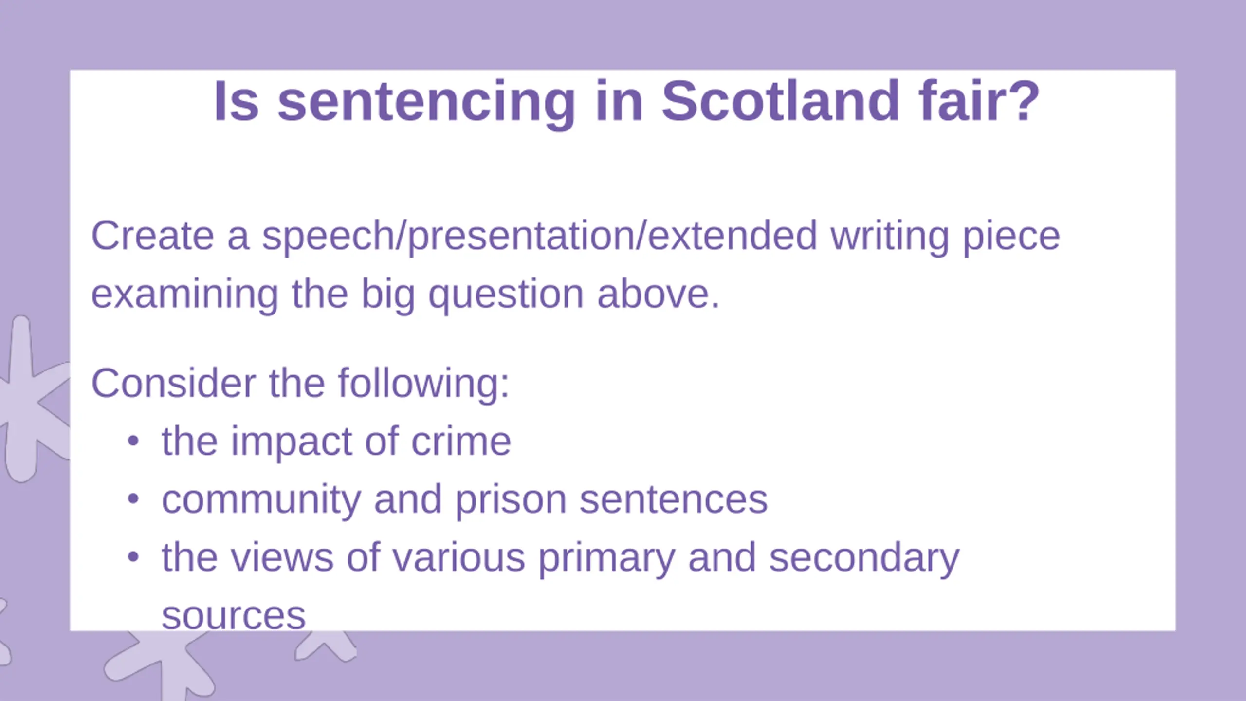 Is sentencing in Scotland fair? Create a speech/presentation/extended writing piece examining the big question above. Consider the following: the impact of crime community and prison sentences the views of various primary and secondary sources