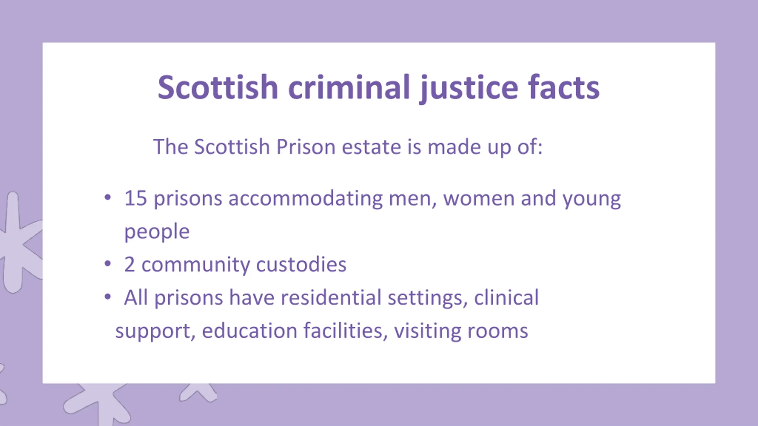 Scottish criminal justice facts The Scottish Prison estate is made up of: 15 prisons accommodating men, women and young people 2 community custodies All prisons have residential settings, clinical support, education facilities, visiting rooms