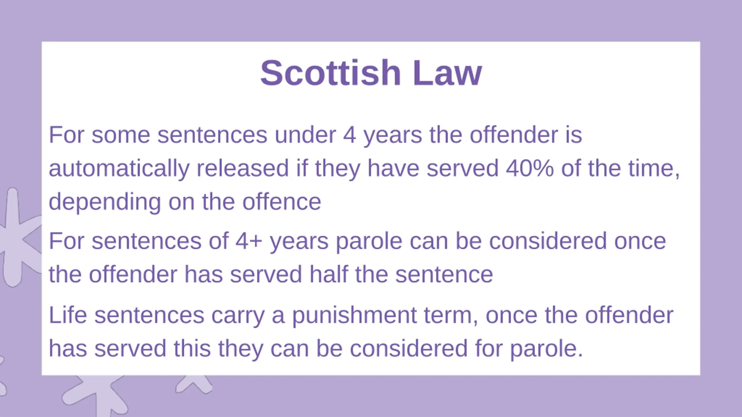 Scottish Law For some sentences under 4 years the offender is automatically released if they have served 40% of the time, depending on the offence For sentences of 4+ years parole can be considered once the offender has served half the sentence Life sentences carry a punishment term, once the offender has served this they can be considered for parole.
