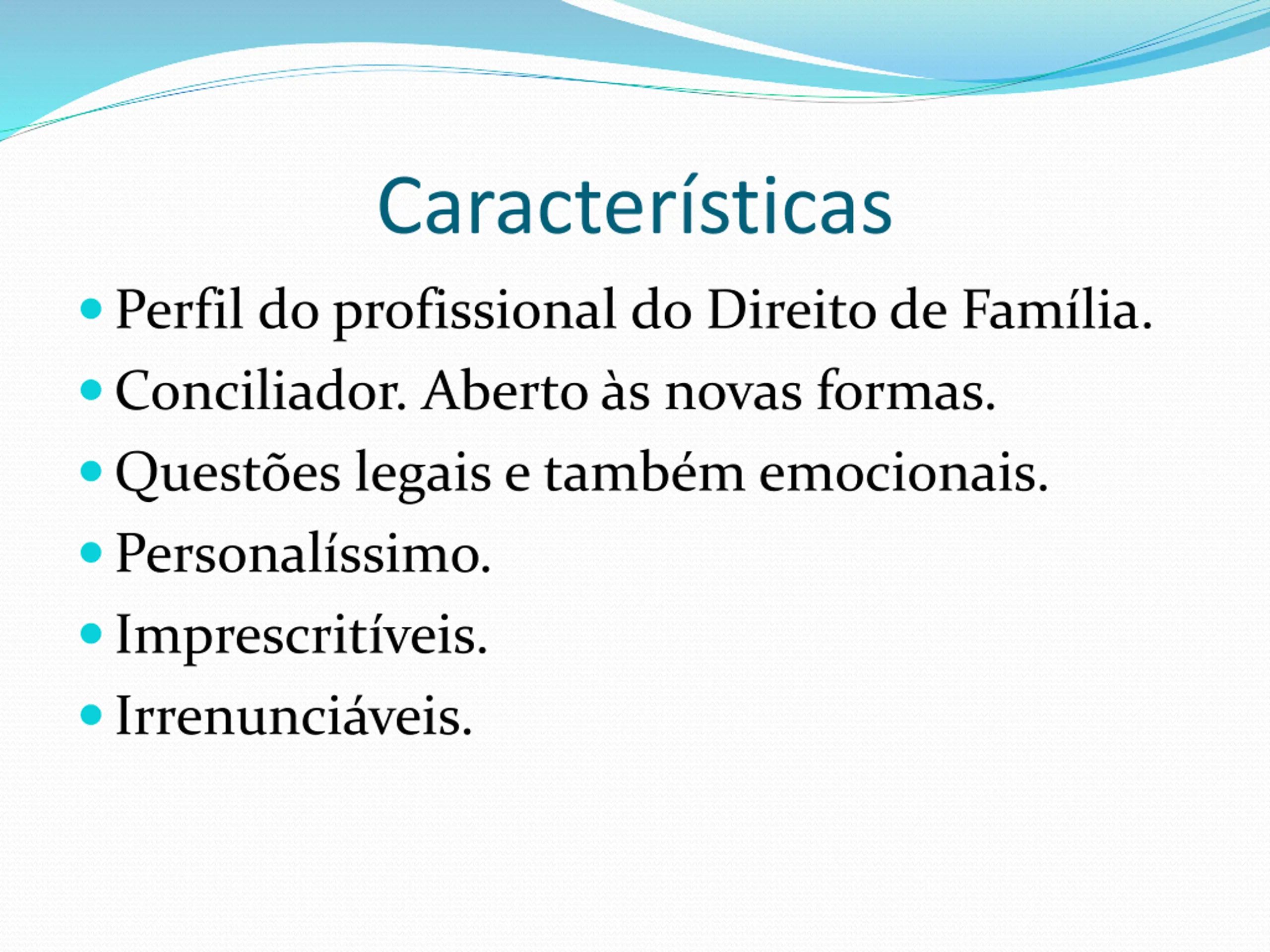 Caractersticas Perfil do profissional do Direitode Fam lia. Conciliador. Aberto s novas formas. Quest es legais e tamb m emocionais. Personal ssimo. Imprescrit veis. Irrenunci veis.