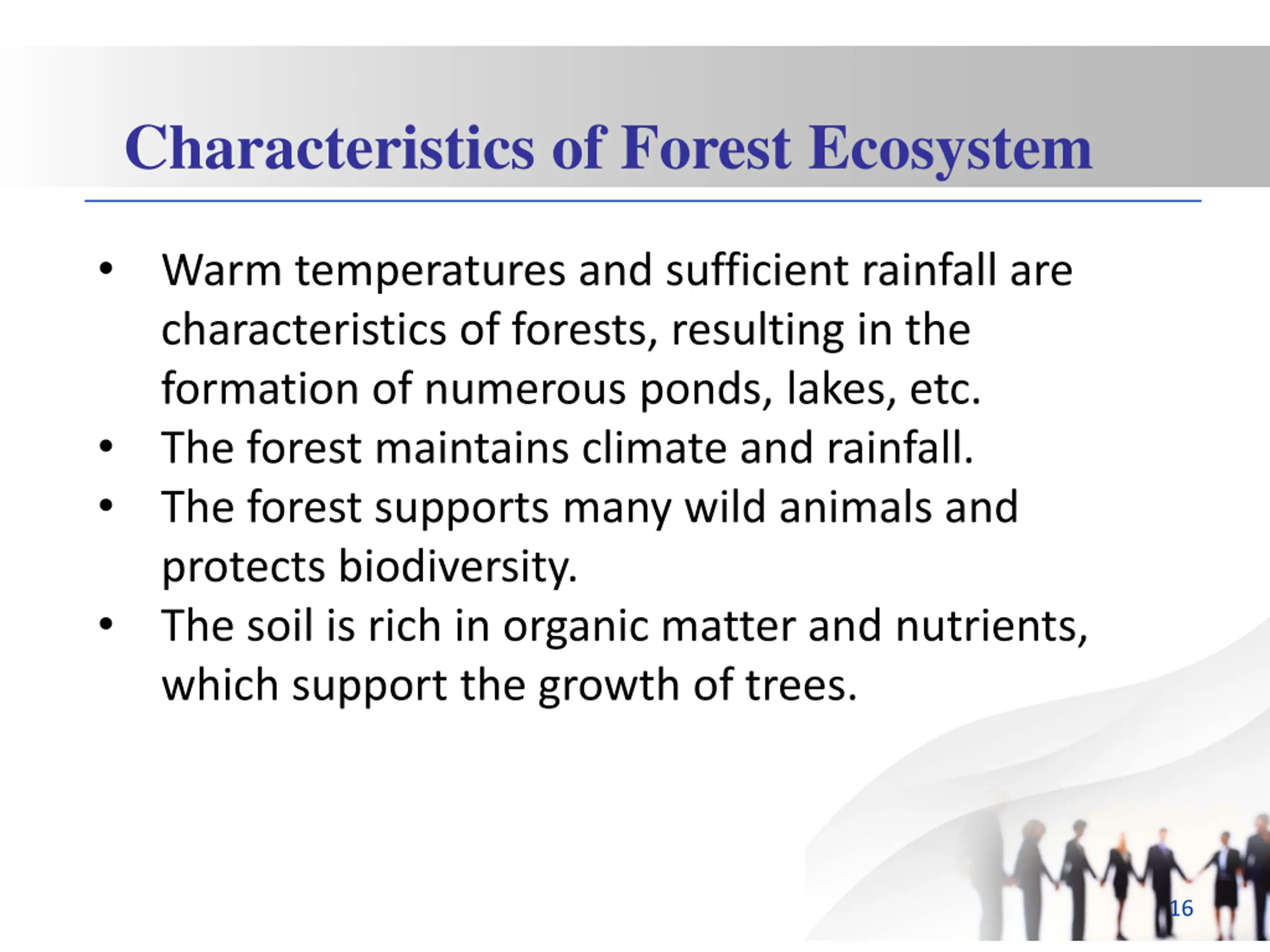 Characteristics of Forest Ecosystem Warm temperatures and sufficient rainfall are characteristics of forests, resulting in the formation of numerous ponds, lakes, etc. The forest maintains climate and rainfall. The forest supports many wild animals and protects biodiversity. The soil is rich in organic matter and nutrients, which support the growth of trees. 16