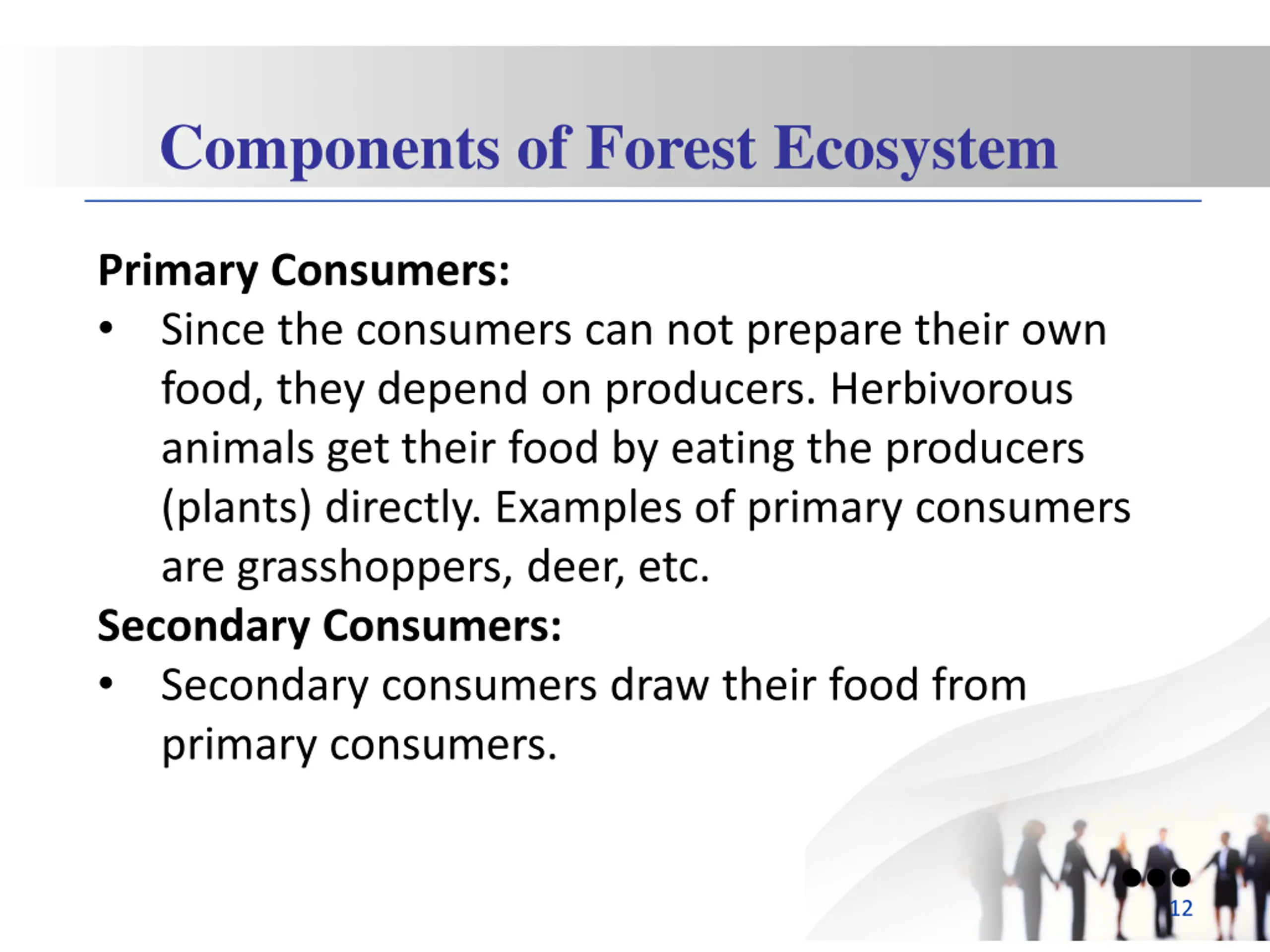 Components of Forest Ecosystem Primary Consumers: Since the consumers can not prepare their own food, they depend on producers. Herbivorous animals get their food by eating the producers (plants) directly. Examples of primary consumers are grasshoppers, deer, etc. Secondary Consumers: Secondary consumers draw their food from primary consumers. 12