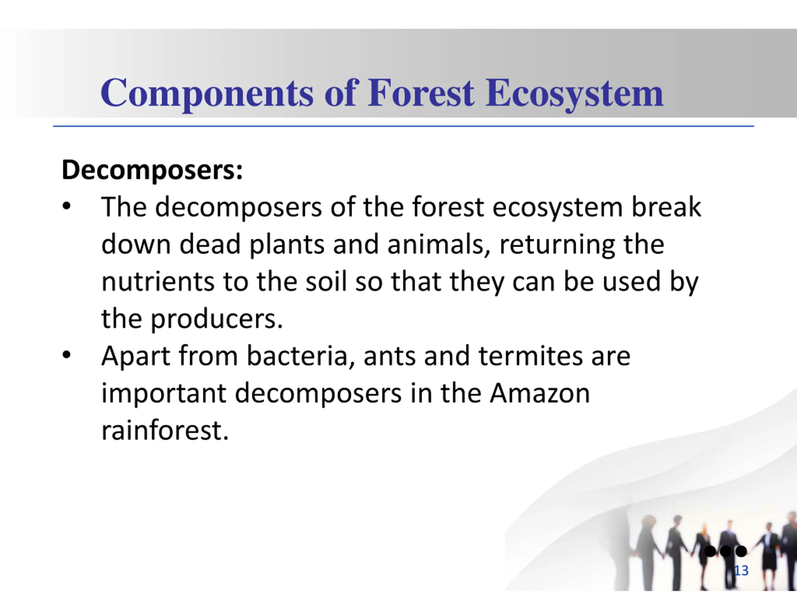 Components of Forest Ecosystem Decomposers: The decomposers of the forest ecosystem break down dead plants and animals, returning the nutrients to the soil so that they can be used by the producers. Apart from bacteria, ants and termites are important decomposers in the Amazon rainforest. 13