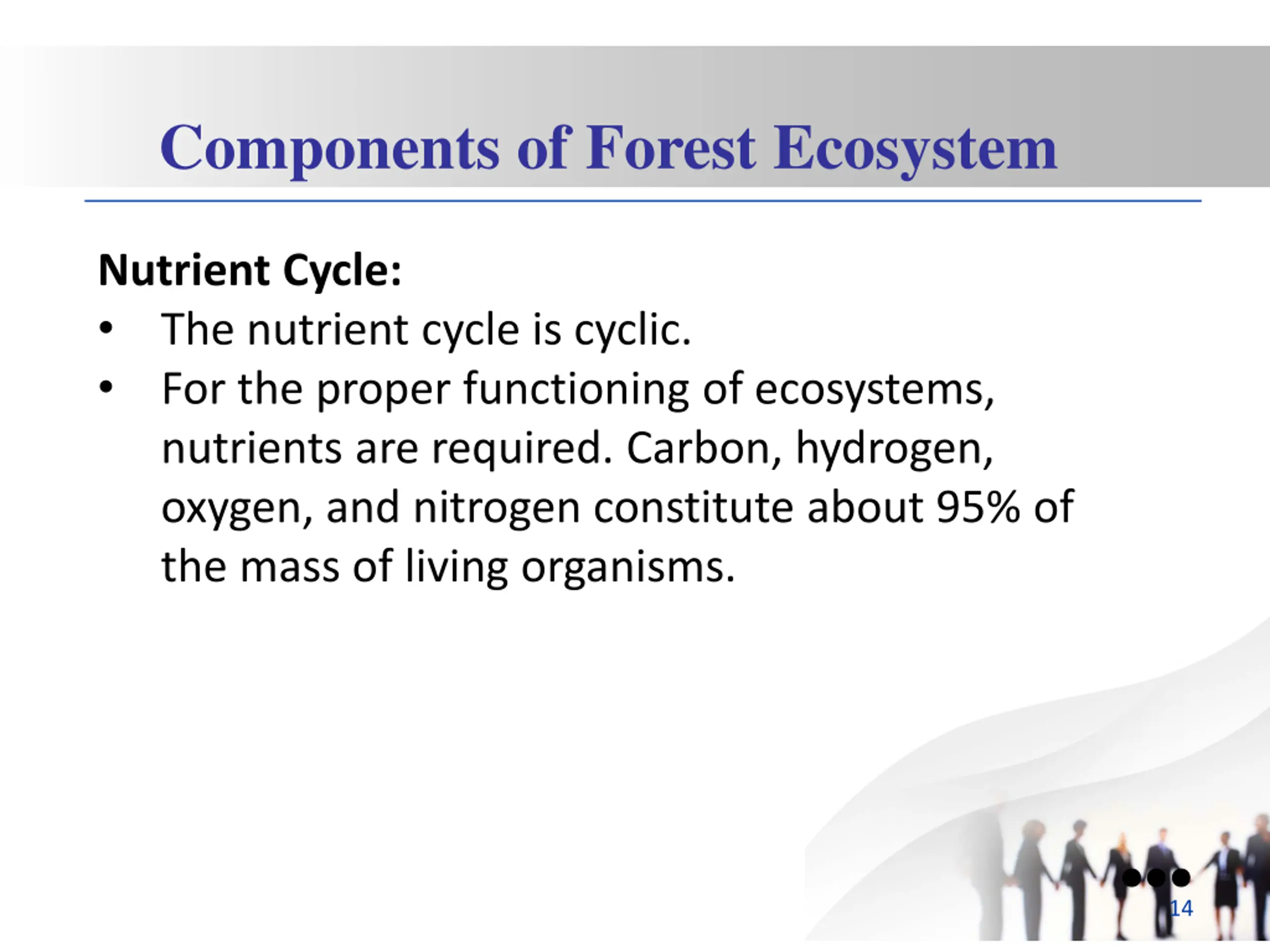 Components of Forest Ecosystem Nutrient Cycle: The nutrient cycle is cyclic. For the proper functioning of ecosystems, nutrients are required. Carbon, hydrogen, oxygen, and nitrogen constitute about 95% of the mass of living organisms. 14
