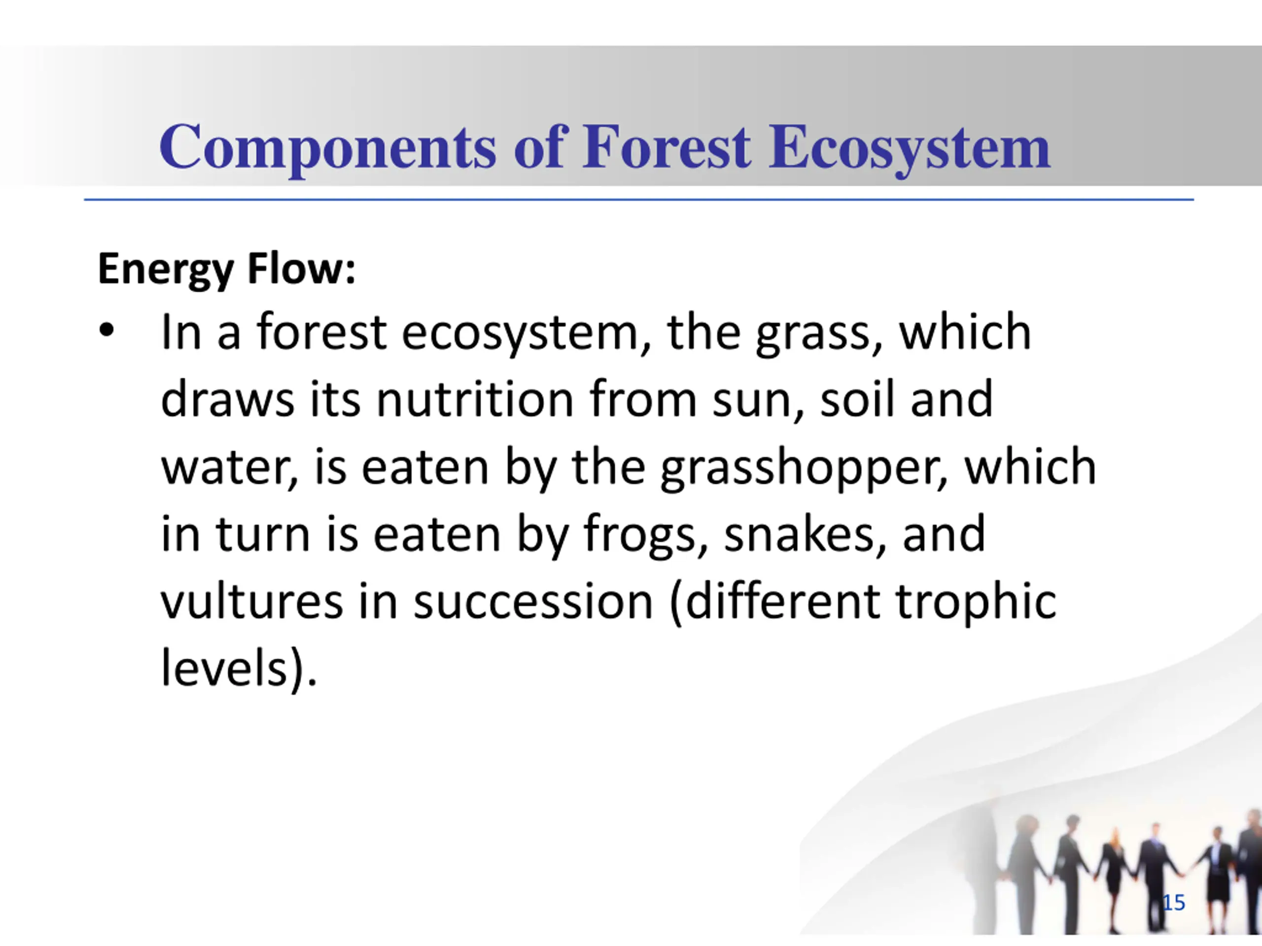 Components of Forest Ecosystem Energy Flow: In a forest ecosystem, the grass, which draws its nutrition from sun, soil and water, is eaten by the grasshopper, which in turn is eaten by frogs, snakes, and vultures in succession (different trophic levels). 15