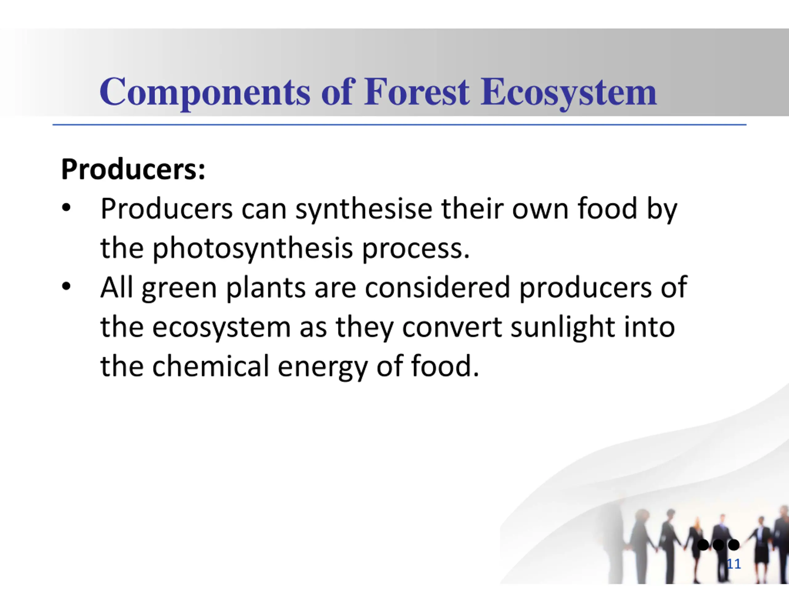 Components of Forest Ecosystem Producers: Producers can synthesise their own food by the photosynthesis process. All green plants are considered producers of the ecosystem as they convert sunlight into the chemical energy of food. 11
