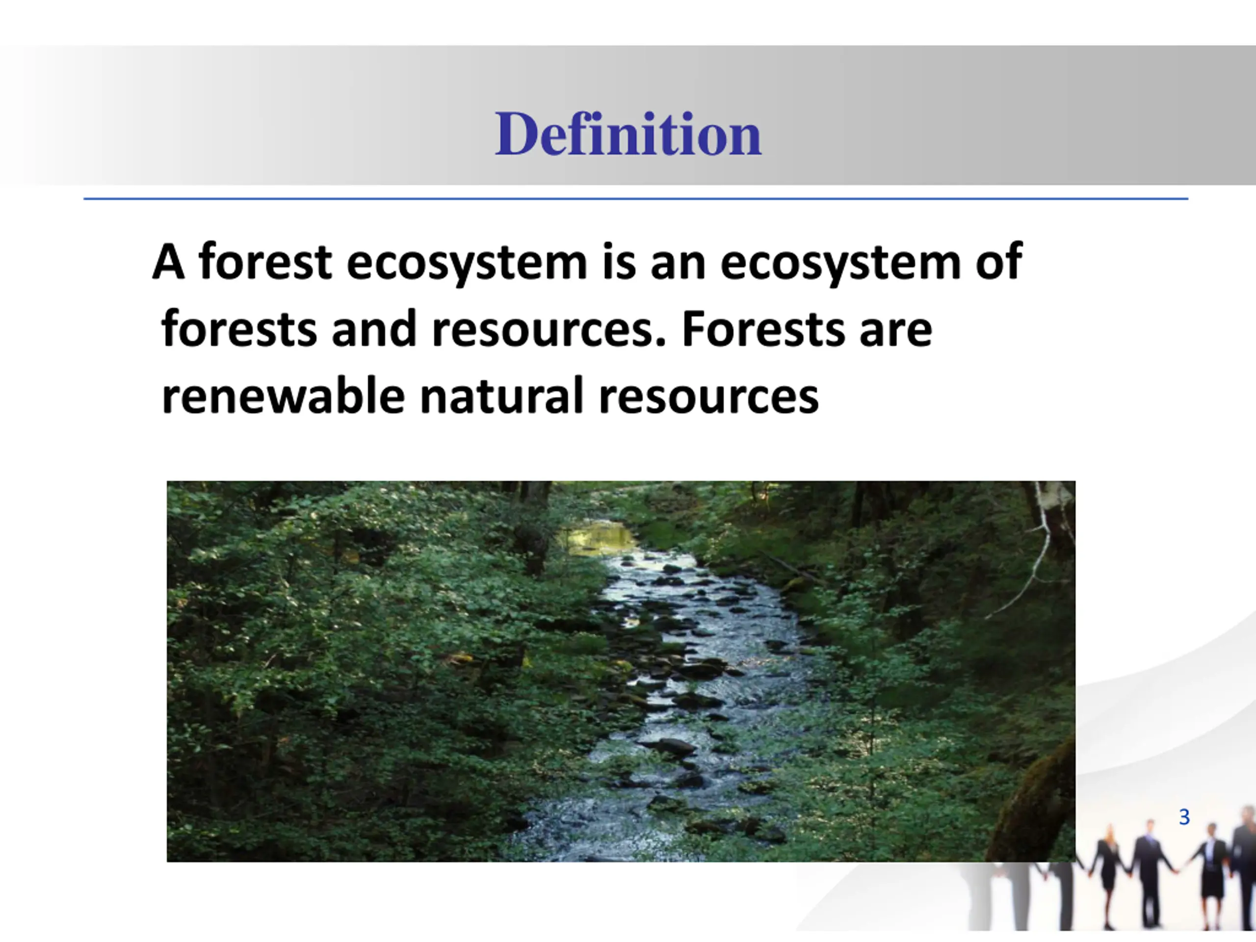 Definition A forest ecosystem is an ecosystem of forests and resources. Forests are renewable natural resources 3