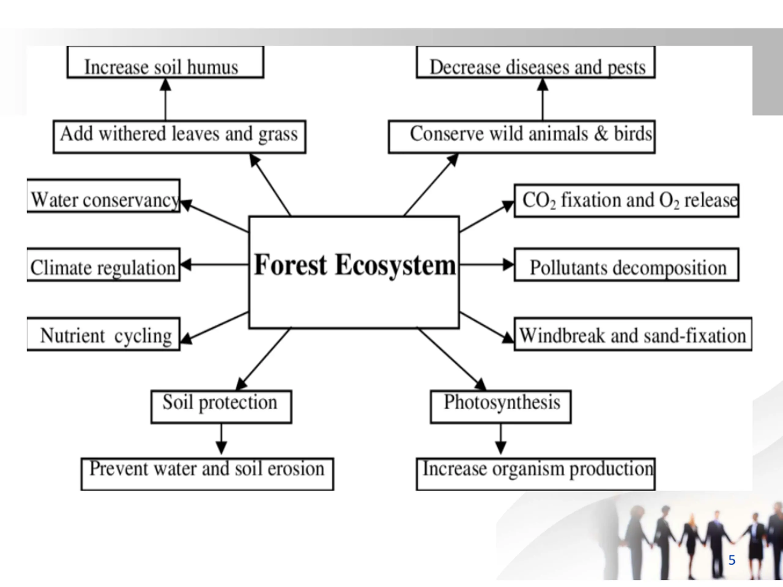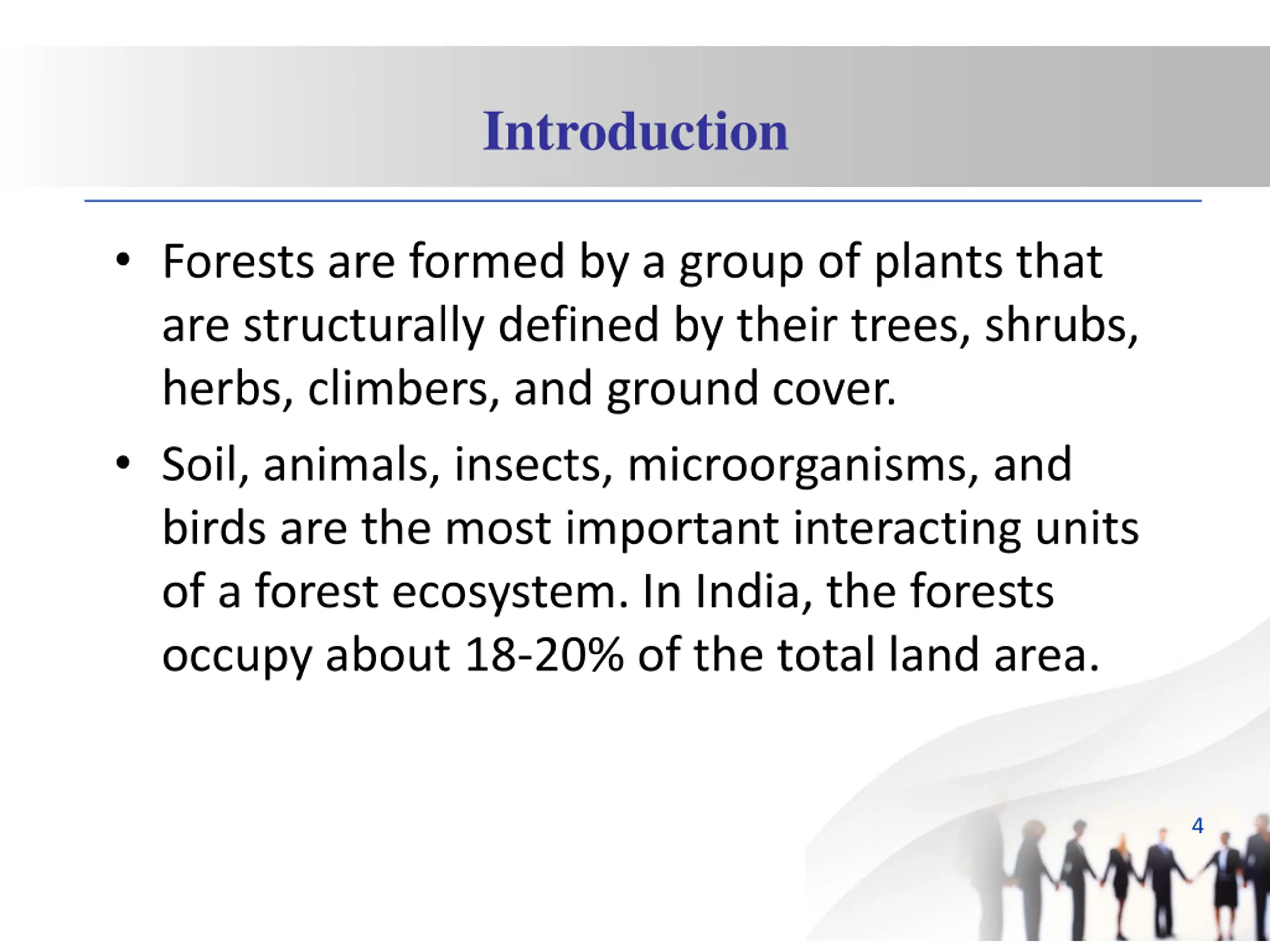 Introduction Forests are formed by a group of plants that are structurally defined by their trees, shrubs, herbs, climbers, and ground cover. Soil, animals, insects, microorganisms, and birds are the most important interacting units of a forest ecosystem. In India, the forests occupy about 18-20% of the total land area. 4