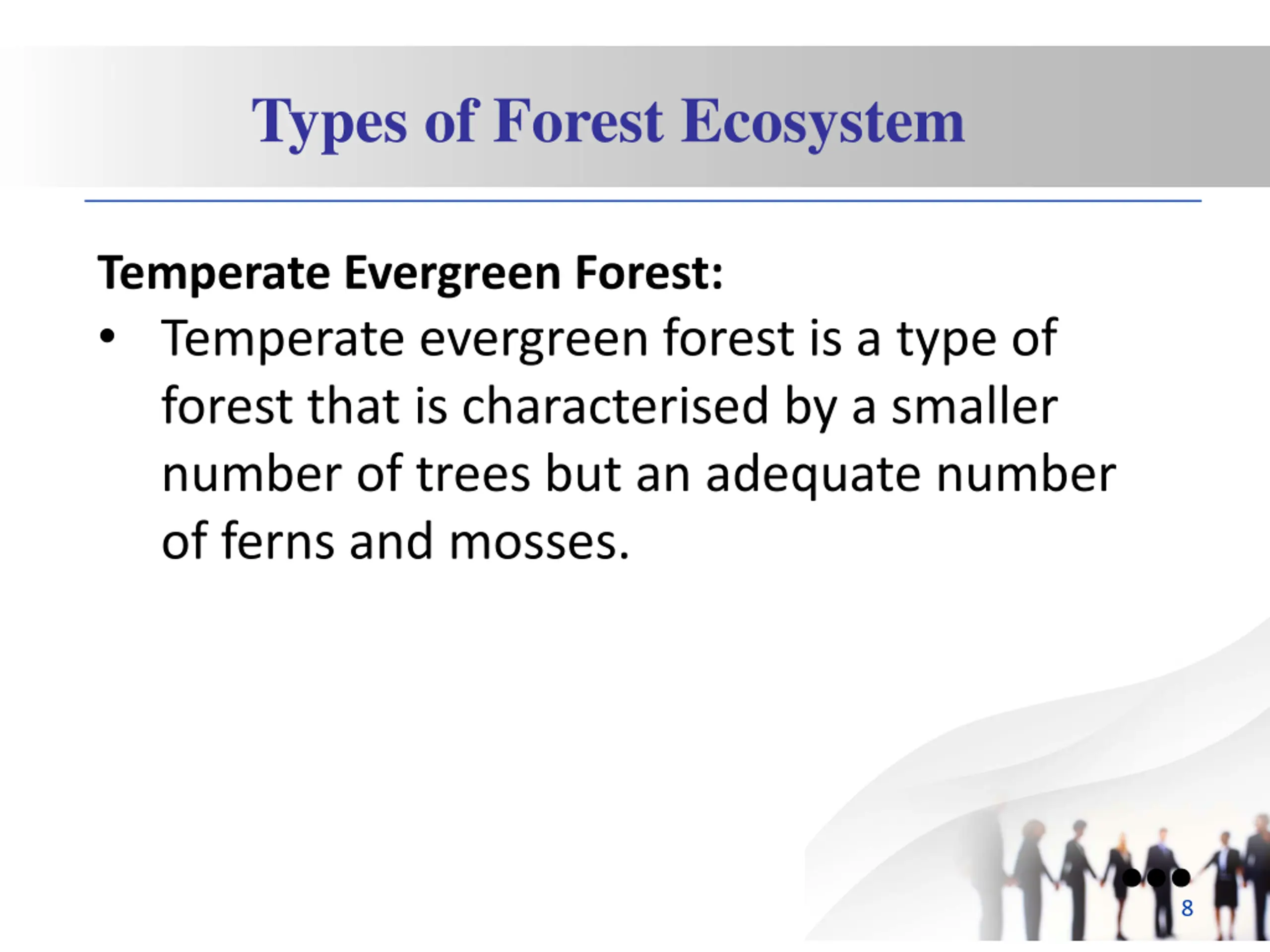 Types of Forest Ecosystem Temperate Evergreen Forest: Temperate evergreen forest is a type of forest that is characterised by a smaller number of trees but an adequate number of ferns and mosses. 8