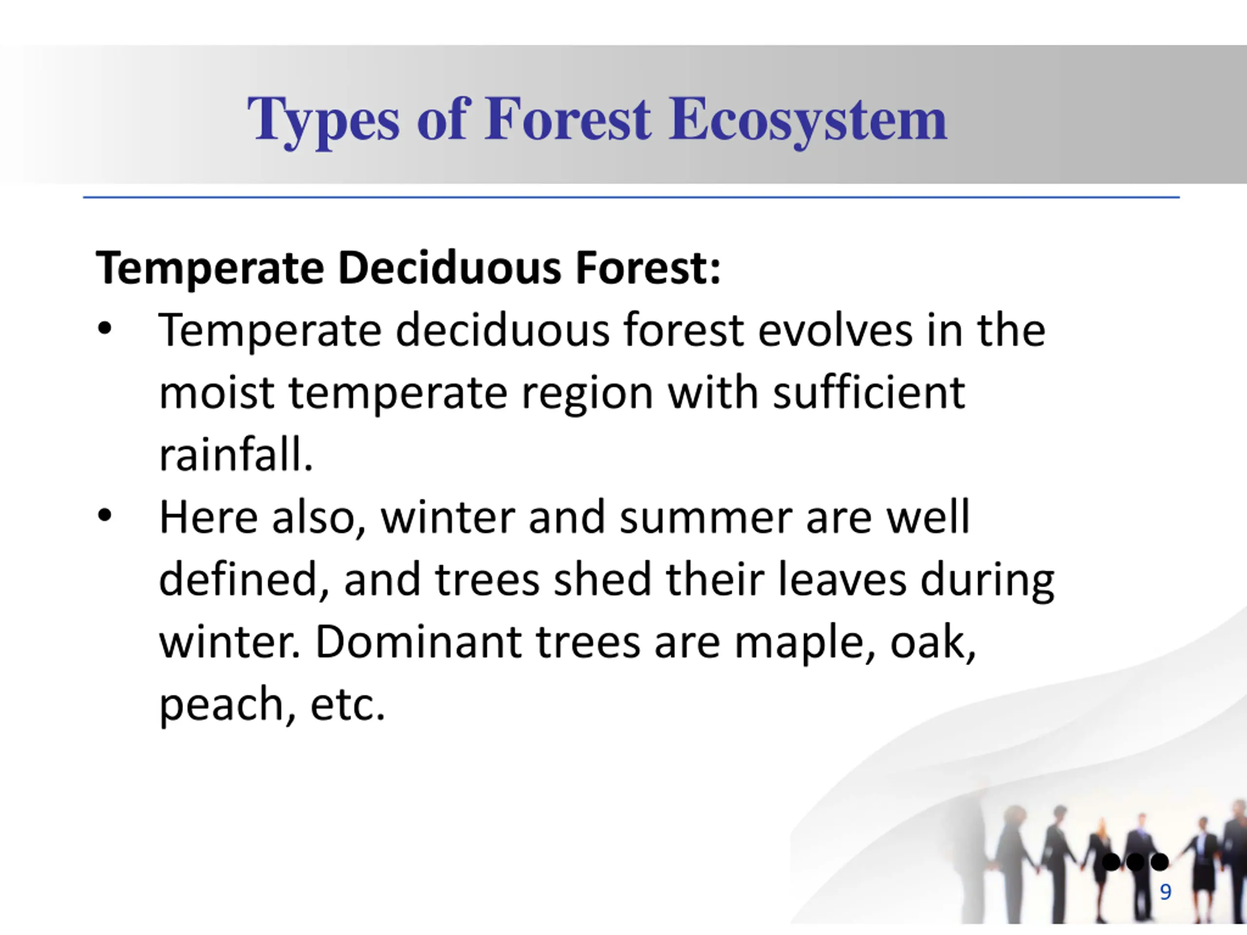 Types of Forest Ecosystem Temperate Deciduous Forest: Temperate deciduous forest evolves in the moist temperate region with sufficient rainfall. Here also, winter and summer are well defined, and trees shed their leaves during winter. Dominant trees are maple, oak, peach, etc. 9