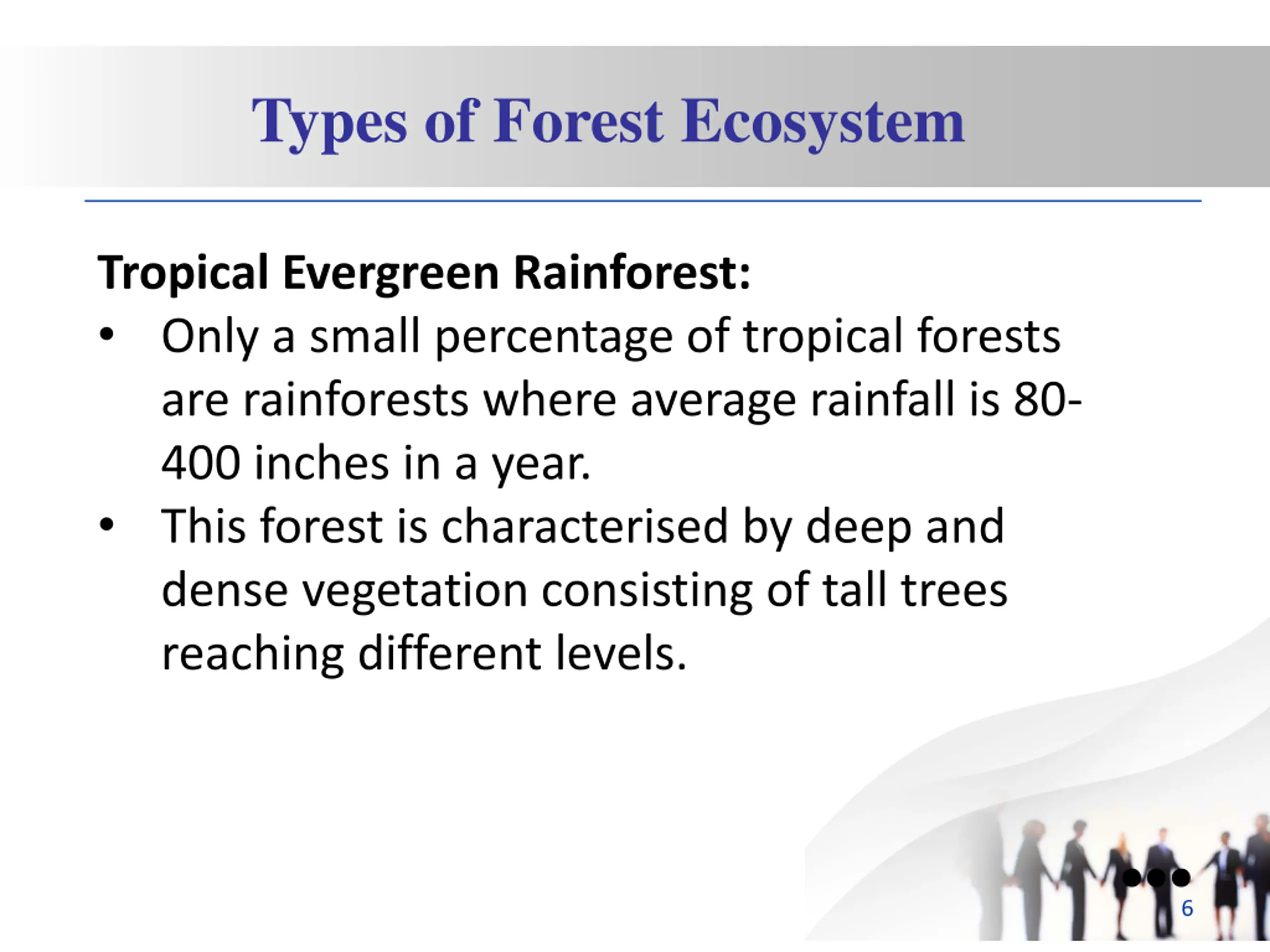 Types of Forest Ecosystem Tropical Evergreen Rainforest: Only a small percentage of tropical forests are rainforests where average rainfall is 80- 400 inches in a year. This forest is characterised by deep and dense vegetation consisting of tall trees reaching different levels. 6