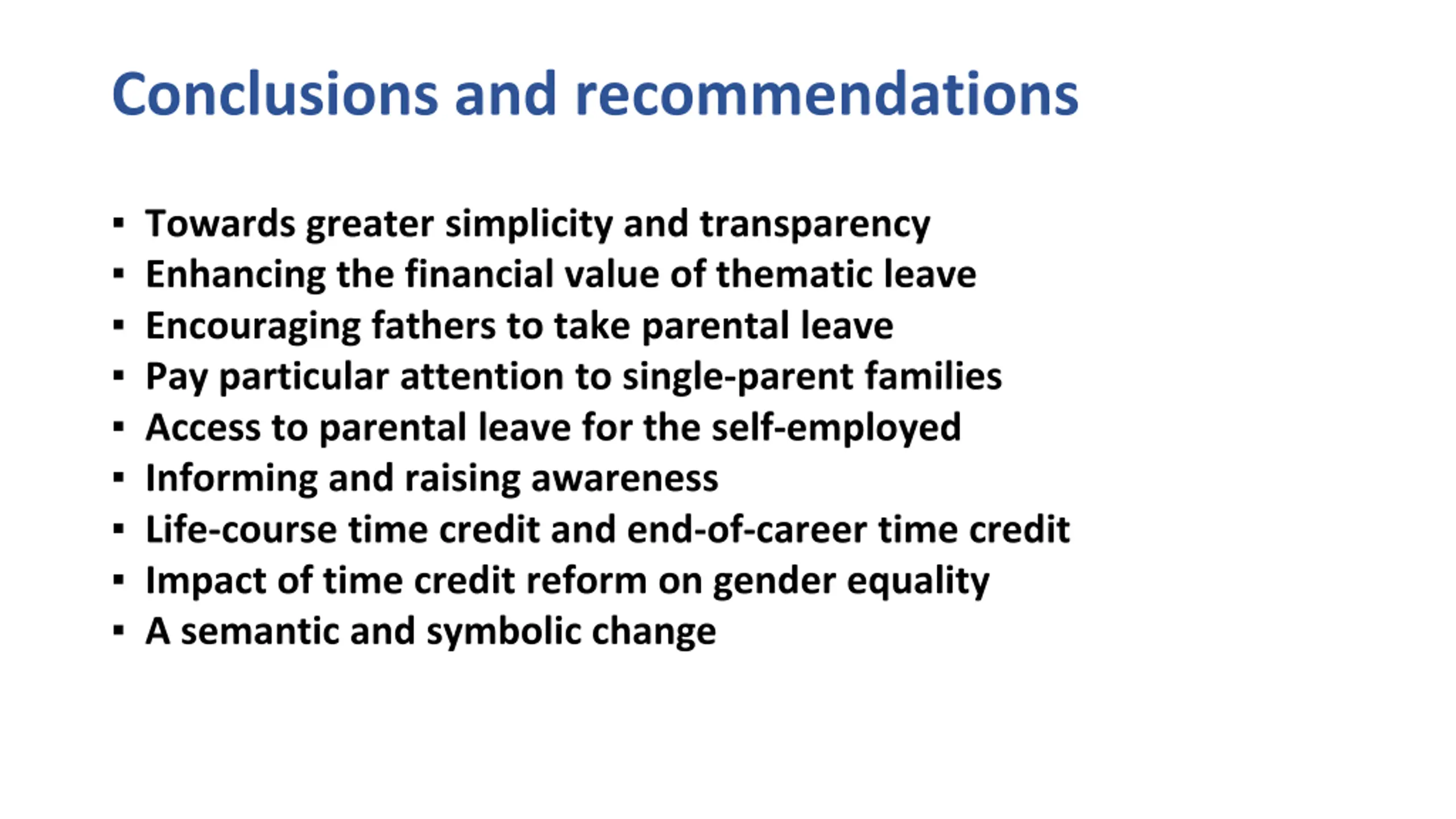 Conclusions and recommendations Towards greater simplicity and transparency Enhancing the financial value of thematic leave Encouraging fathers to take parental leave Pay particular attention to single-parent families Access to parental leave for the self-employed Informing and raising awareness Life-course time credit and end-of-career time credit Impact of time credit reform on gender equality A semantic and symbolic change