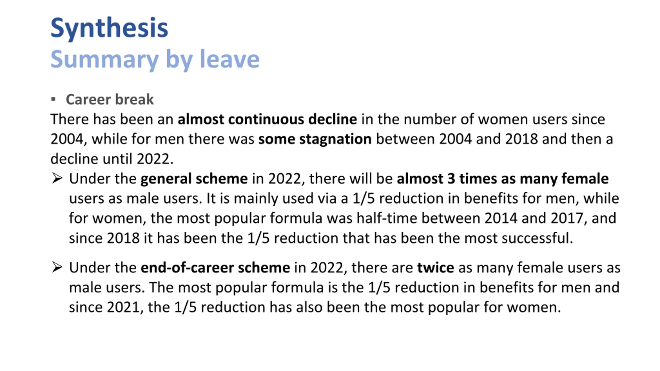 Synthesis Summary by leave Career break There has been an almost continuous decline in the number of women users since 2004, while for men there was some stagnation between 2004 and 2018 and then a decline until 2022. Under the general scheme in 2022, there will be almost 3 times as many female users as male users. It is mainly used via a 1/5 reduction in benefits for men, while for women, the most popular formula was half-time between 2014 and 2017, and since 2018 it has been the 1/5 reduction that has been the most successful. Under the end-of-career scheme in 2022, there are twice as many female users as male users. The most popular formula is the 1/5 reduction in benefits for men and since 2021, the 1/5 reduction has also been the most popular for women.