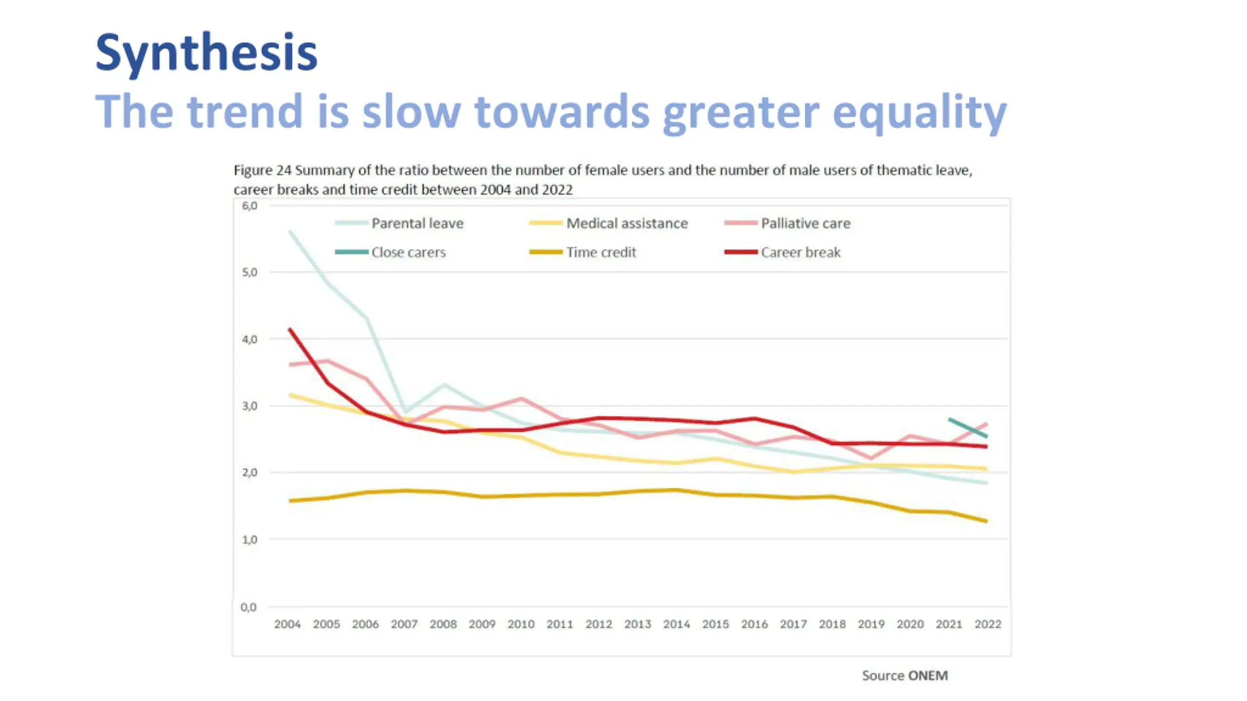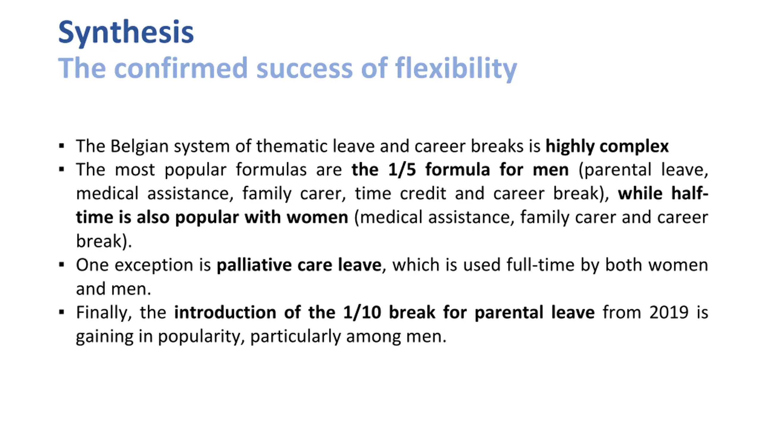 Synthesis The confirmed success of flexibility The Belgian system of thematic leave and career breaks is highly complex The most popular formulas are the 1/5 formula for men (parental leave, medical assistance, family carer, time credit and career break), while half- time is also popular with women (medical assistance, family carer and career break). One exception is palliative care leave, which is used full-time by both women and men. Finally, the introduction of the 1/10 break for parental leave from 2019 is gaining in popularity, particularly among men.