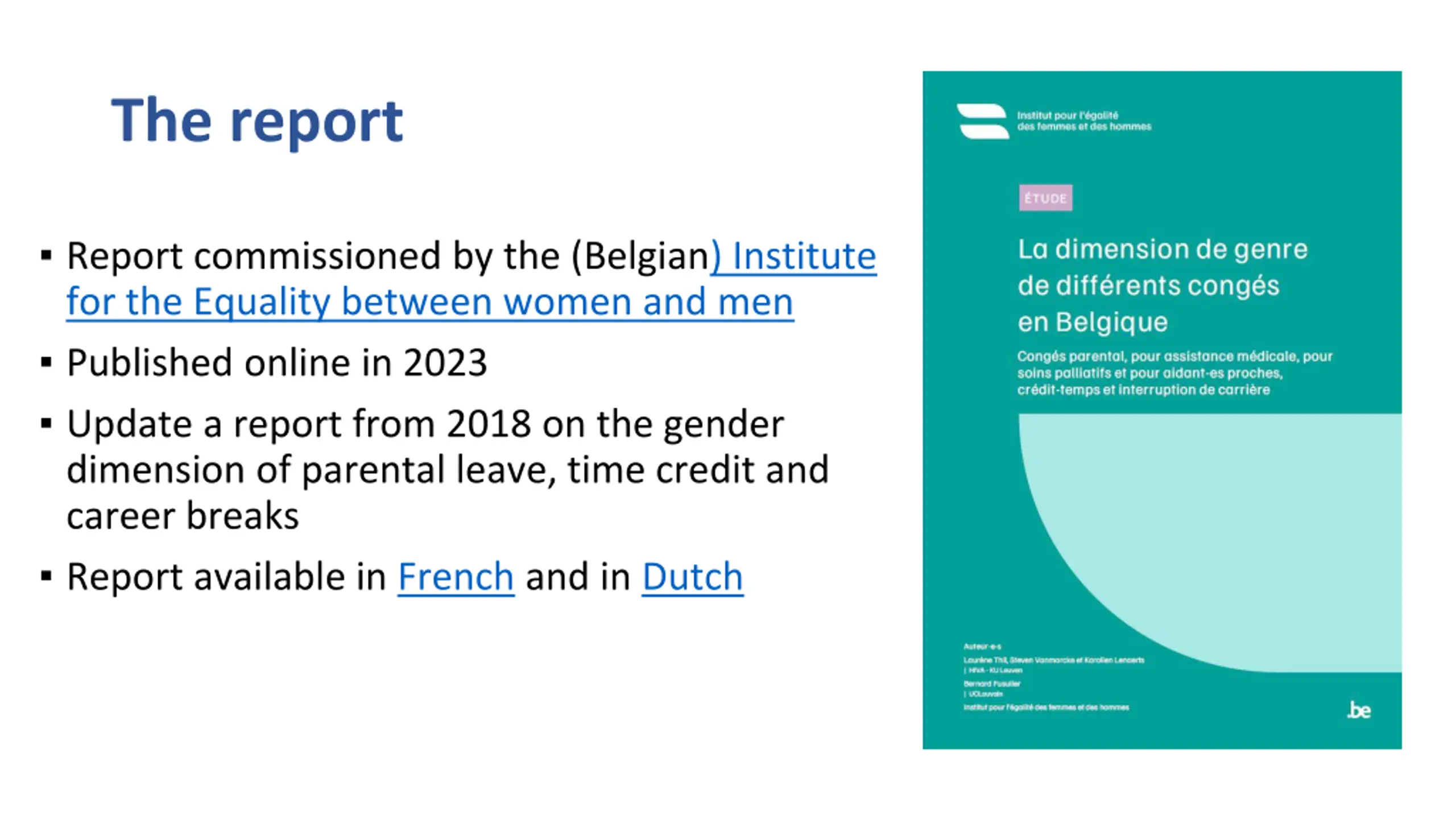The report Report commissioned by the (Belgian) Institute for the Equality between women and men Published online in 2023 Update a report from 2018 on the gender dimension of parental leave, time credit and career breaks Report available in French and in Dutch