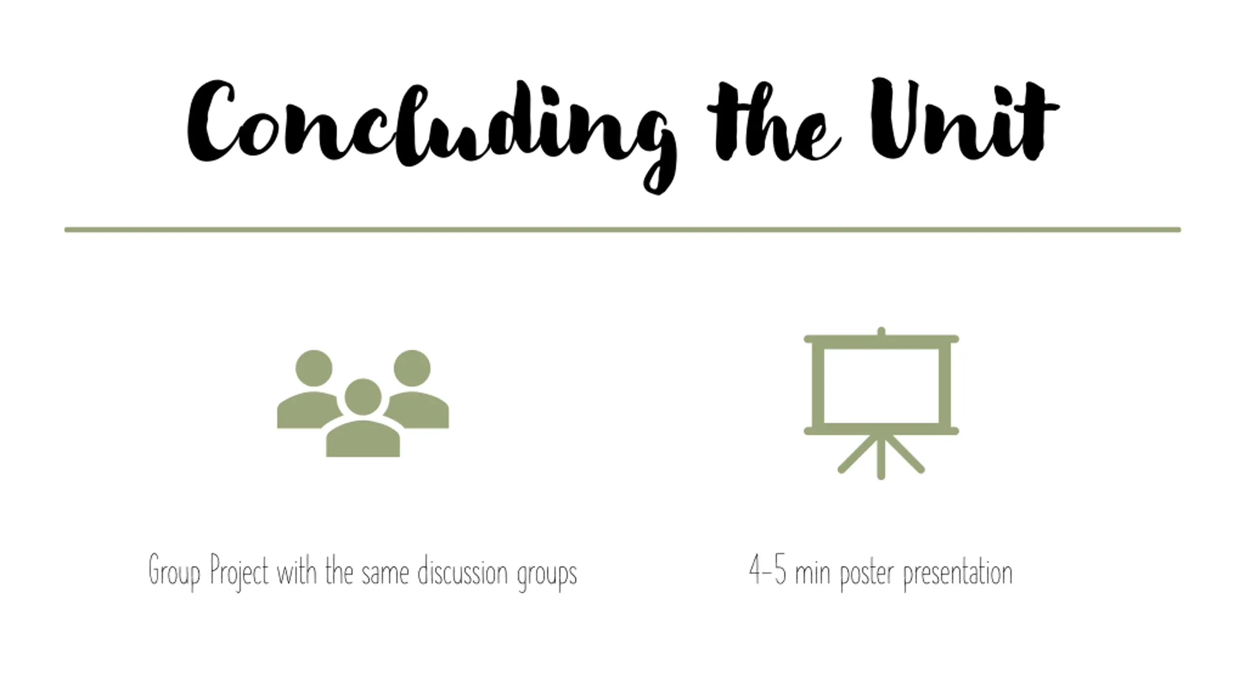 Concluding the Unit Group Project with the same discussion groups 4-5 min poster presentation