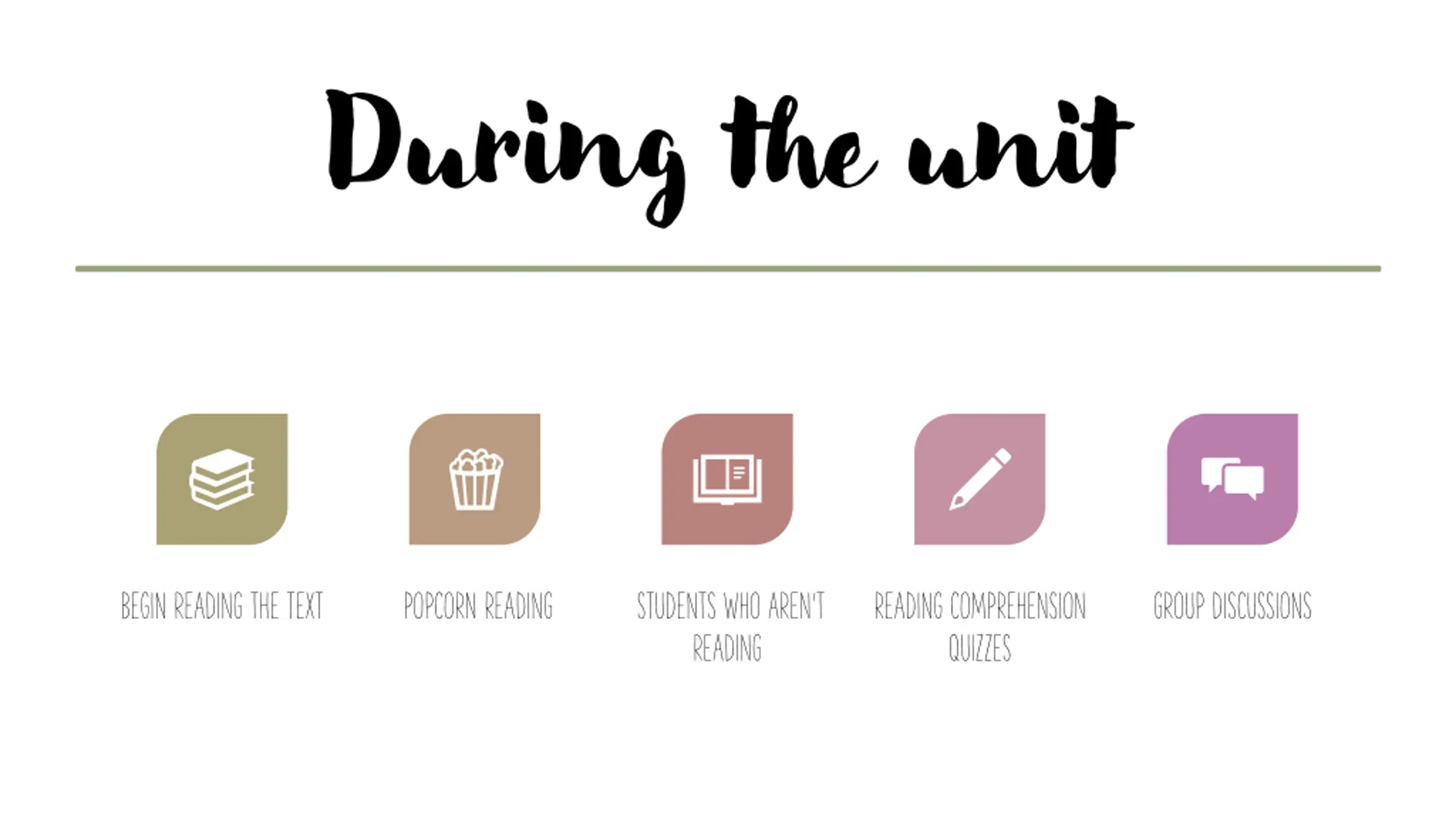 During the unit BEGIN READING THE TEXT POPCORN READING STUDENTS WHO AREN T READING READING COMPREHENSION QUIZZES GROUP DISCUSSIONS