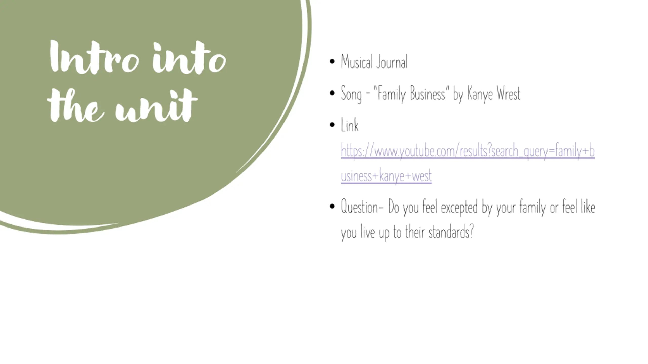 Intro into the unit Musical Journal Song Family Business by Kanye Wrest Link https://www.youtube.com/results?search_query=family+b usiness+kanye+west Question-Do you feel excepted by your family or feel like you live up to their standards?