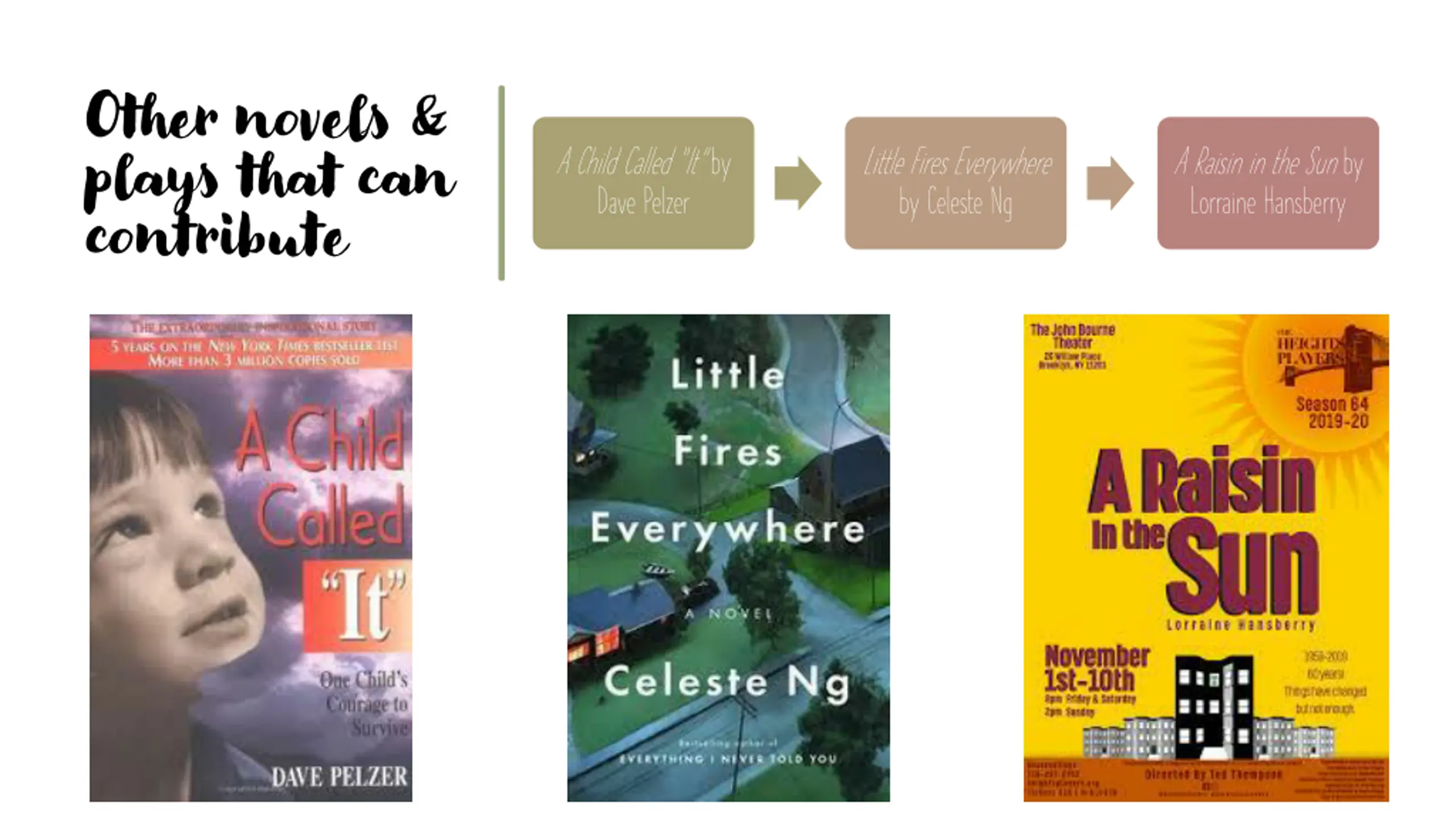 Other novels & plays that can contribute A Child Called It by Dave Pelzer Little Fires Everywhere by Celeste Ng A Raisin in the Sun by Lorraine Hansberry