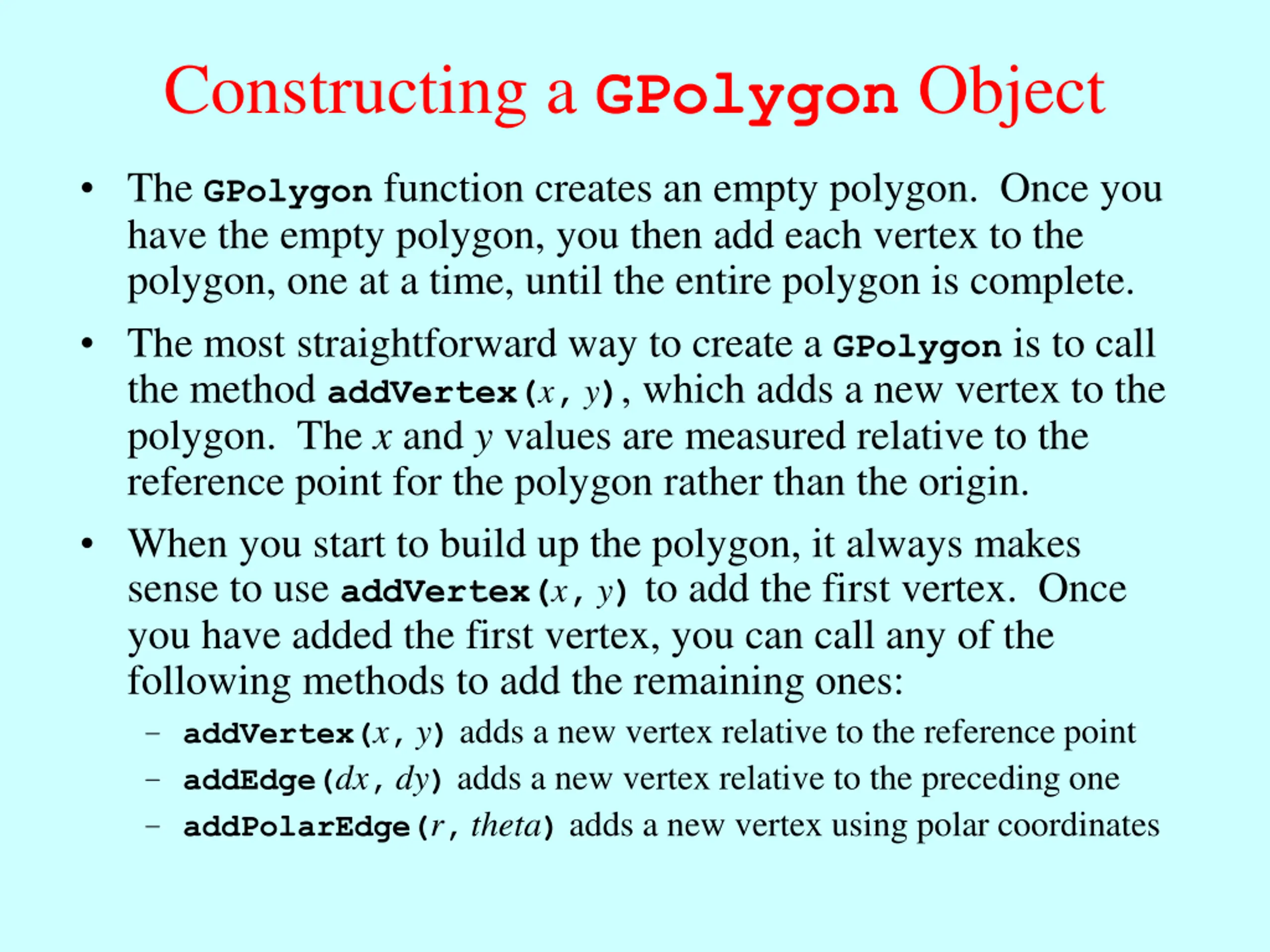 Constructing a GPolygon Object The GPolygon function creates an empty polygon. Once you have the empty polygon, you then add each vertex to the polygon, one at a time, until the entire polygon is complete. The most straightforward way to create a GPolygon is to call the method addVertex(x, y), which adds a new vertex to the polygon. The x and y values are measured relative to the reference point for the polygon rather than the origin. When you start to build up the polygon, it always makes sense to use addVertex(x, y) to add the first vertex. Once you have added the first vertex, you can call any of the following methods to add the remaining ones: addVertex(x, y) adds a new vertex relative to the reference point addEdge(dx, dy) adds a new vertex relative to the preceding one addPolarEdge(r, theta) adds a new vertex using polar coordinates