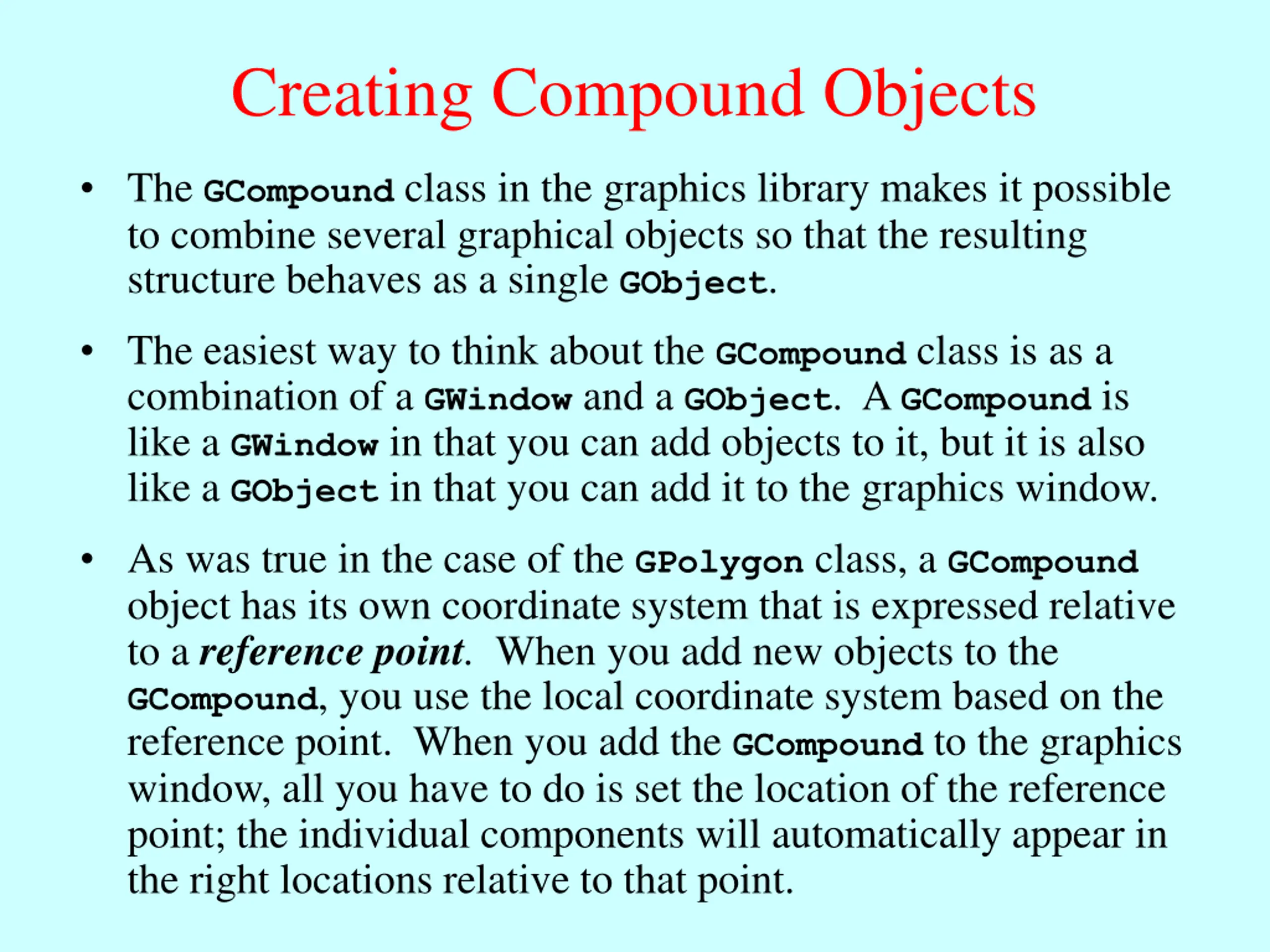 Creating Compound Objects The GCompound class in the graphics library makes it possible to combine several graphical objects so that the resulting structure behaves as a single GObject. The easiest way to think about the GCompound class is as a combination of a GWindow and a GObject. A GCompound is like a GWindow in that you can add objects to it, but it is also like a GObject in that you can add it to the graphics window. As was true in the case of the GPolygon class, a GCompound object has its own coordinate system that is expressed relative to a reference point. When you add new objects to the GCompound, you use the local coordinate system based on the reference point. When you add the GCompound to the graphics window, all you have to do is set the location of the reference point; the individual components will automatically appear in the right locations relative to that point.