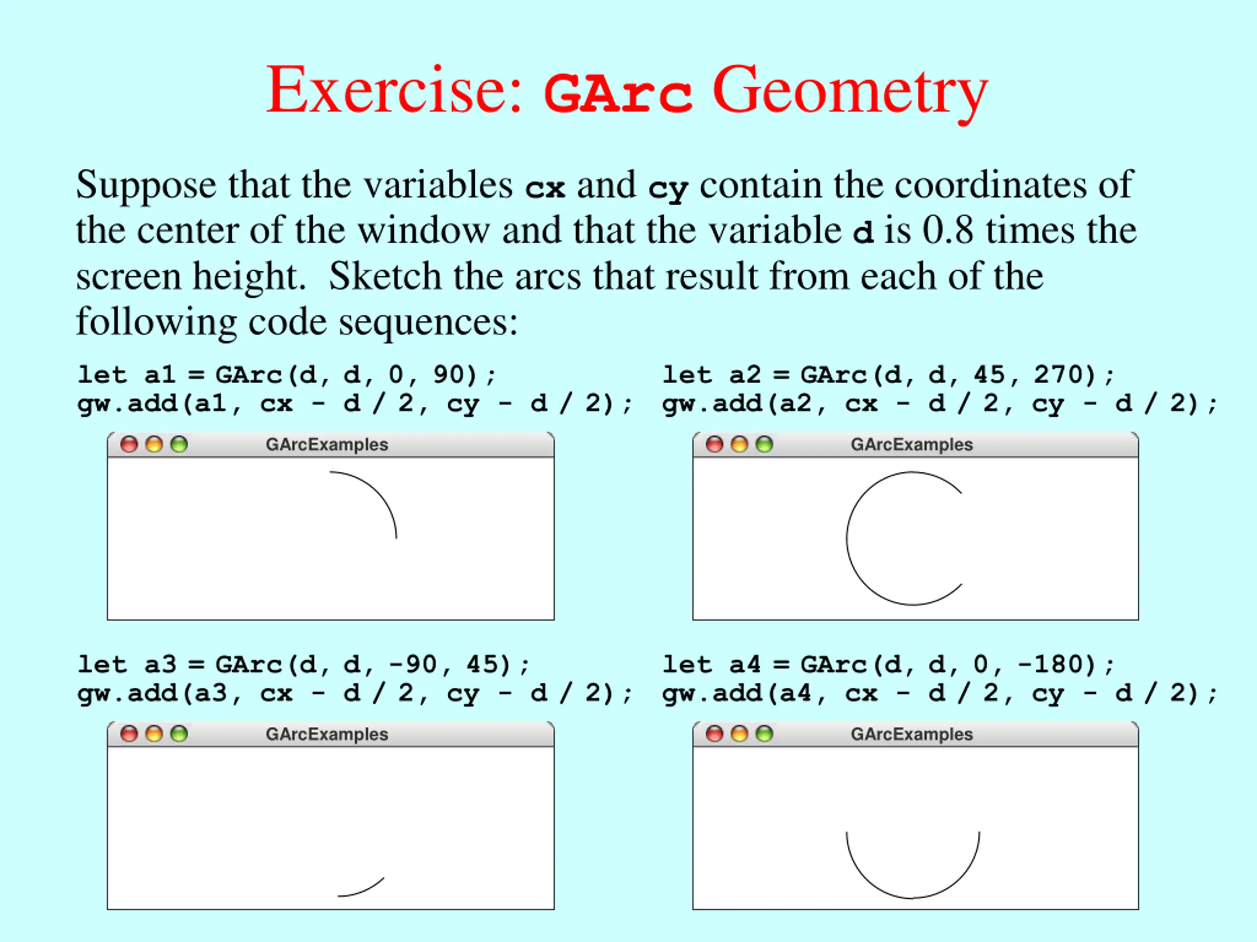 Exercise: GArc Geometry Suppose that the variables cx and cy contain the coordinates of the center of the window and that the variable d is 0.8 times the screen height. Sketch the arcs that result from each of the following code sequences: let a1=GArc(d,d,0,90); gw.add(a1,cx - d/2,cy - d/2); let a2=GArc(d,d,45,270); gw.add(a2,cx - d/2,cy - d/2); GArcExamples GArcExamples let a3=GArc(d,d,-90,45); gw.add(a3,cx - d/2,cy - d/2); let a4=GArc(d,d,0,-180); gw.add(a4,cx - d/2,cy - d/2); GArcExamples GArcExamples