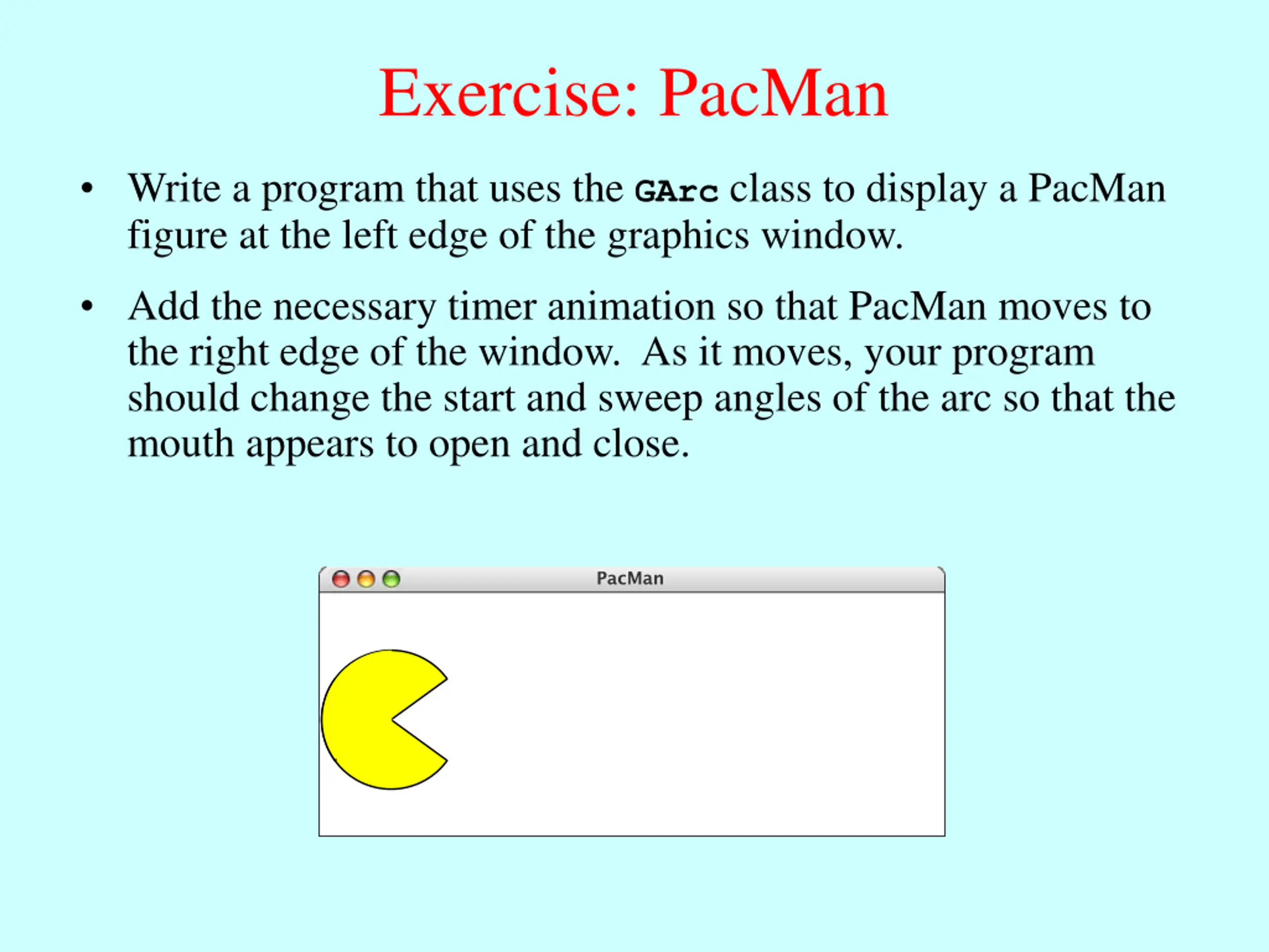 Exercise: PacMan Write a program that uses the GArc class to display a PacMan figure at the left edge of the graphics window. Add the necessary timer animation so that PacMan moves to the right edge of the window. As it moves, your program should change the start and sweep angles of the arc so that the mouth appears to open and close. PacMan