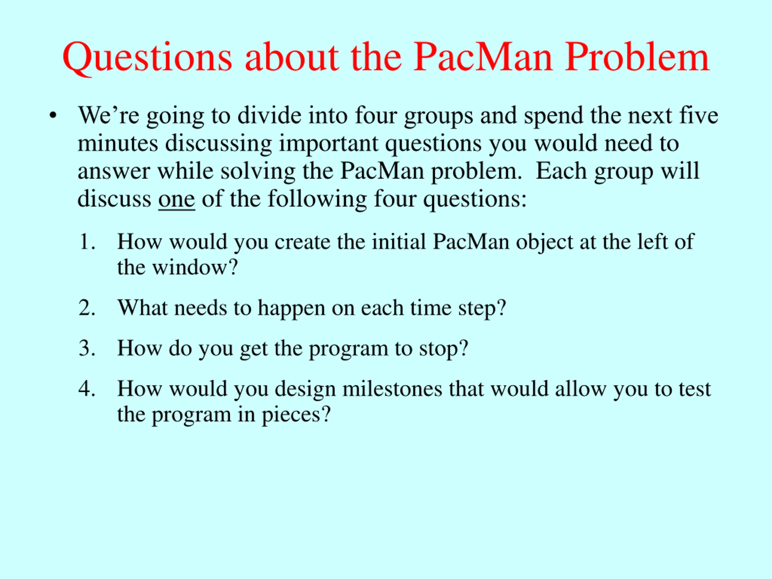 Questions about the PacMan Problem We re going to divide into four groups and spend the next five minutes discussing important questions you would need to answer while solving the PacMan problem. Each group will discuss one of the following four questions: 1. How would you create the initial PacMan object at the left of the window? 2. What needs to happen on each time step? 3. How do you get the program to stop? 4. How would you design milestones that would allow you to test the program in pieces?