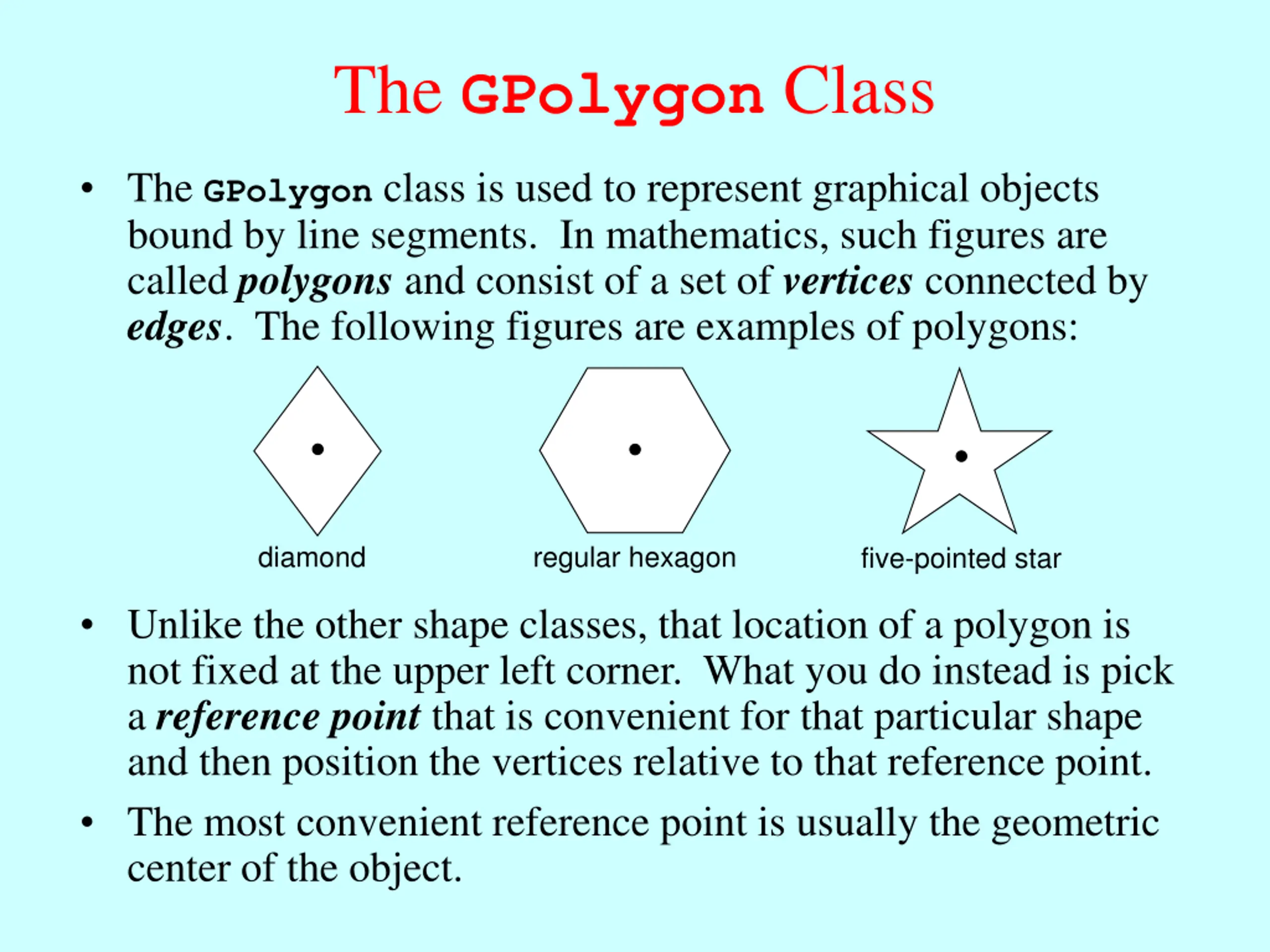 The GPolygon Class The GPolygon class is used to represent graphical objects bound by line segments. In mathematics, such figures are called polygons and consist of a set of vertices connected by edges. The following figures are examples of polygons: diamond regular hexagon five-pointed star Unlike the other shape classes, that location of a polygon is not fixed at the upper left corner. What you do instead is pick a reference point that is convenient for that particular shape and then position the vertices relative to that reference point. The most convenient reference point is usually the geometric center of the object.