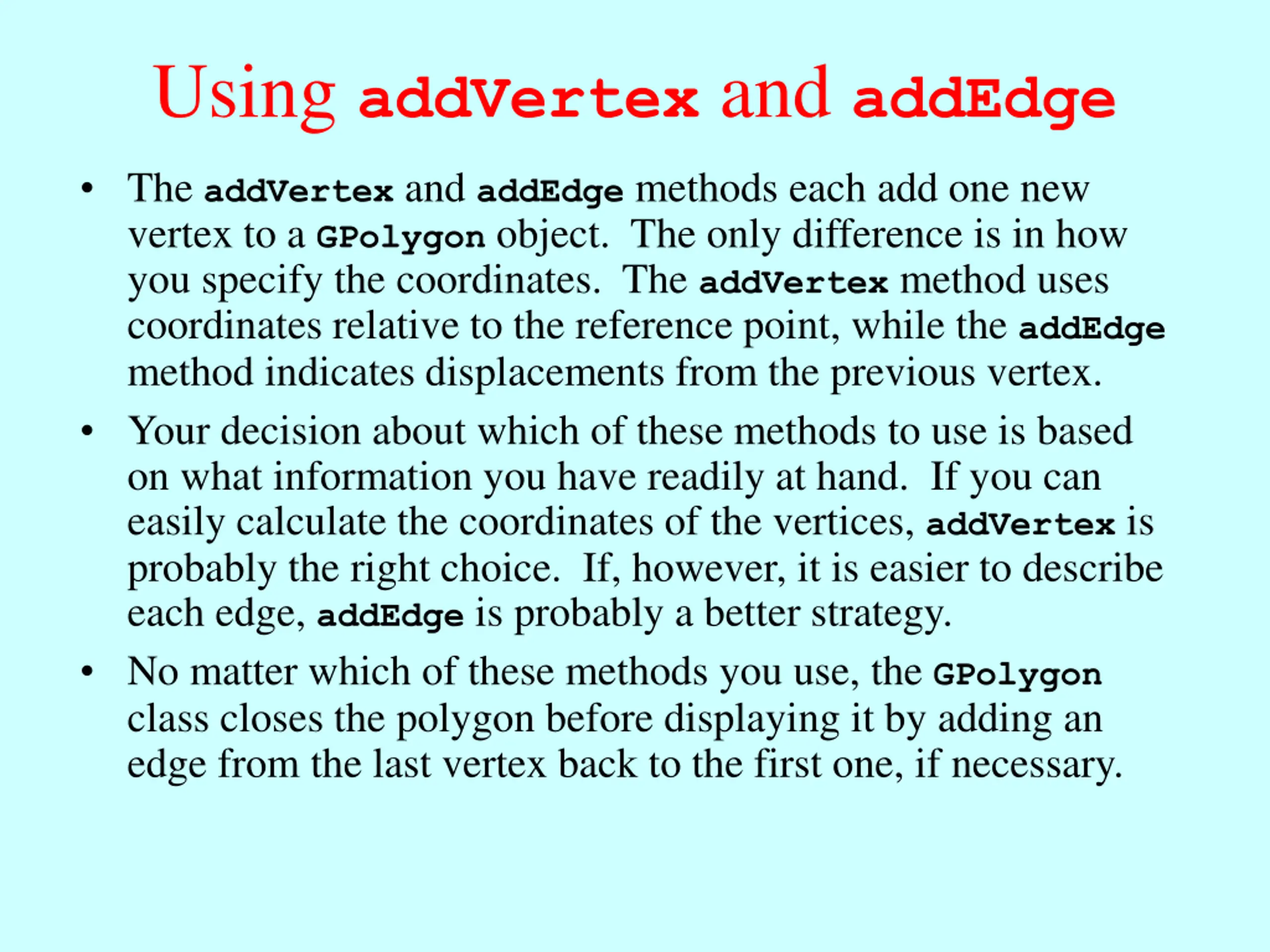 UsingaddVertex andaddEdge The addVertex and addEdge methods each add one new vertex to a GPolygon object. The only difference is in how you specify the coordinates. The addVertex method uses coordinates relative to the reference point, while the addEdge method indicates displacements from the previous vertex. Your decision about which of these methods to use is based on what information you have readily at hand. If you can easily calculate the coordinates of the vertices, addVertex is probably the right choice. If, however, it is easier to describe each edge, addEdge is probably a better strategy. No matter which of these methods you use, the GPolygon class closes the polygon before displaying it by adding an edge from the last vertex back to the first one, if necessary.