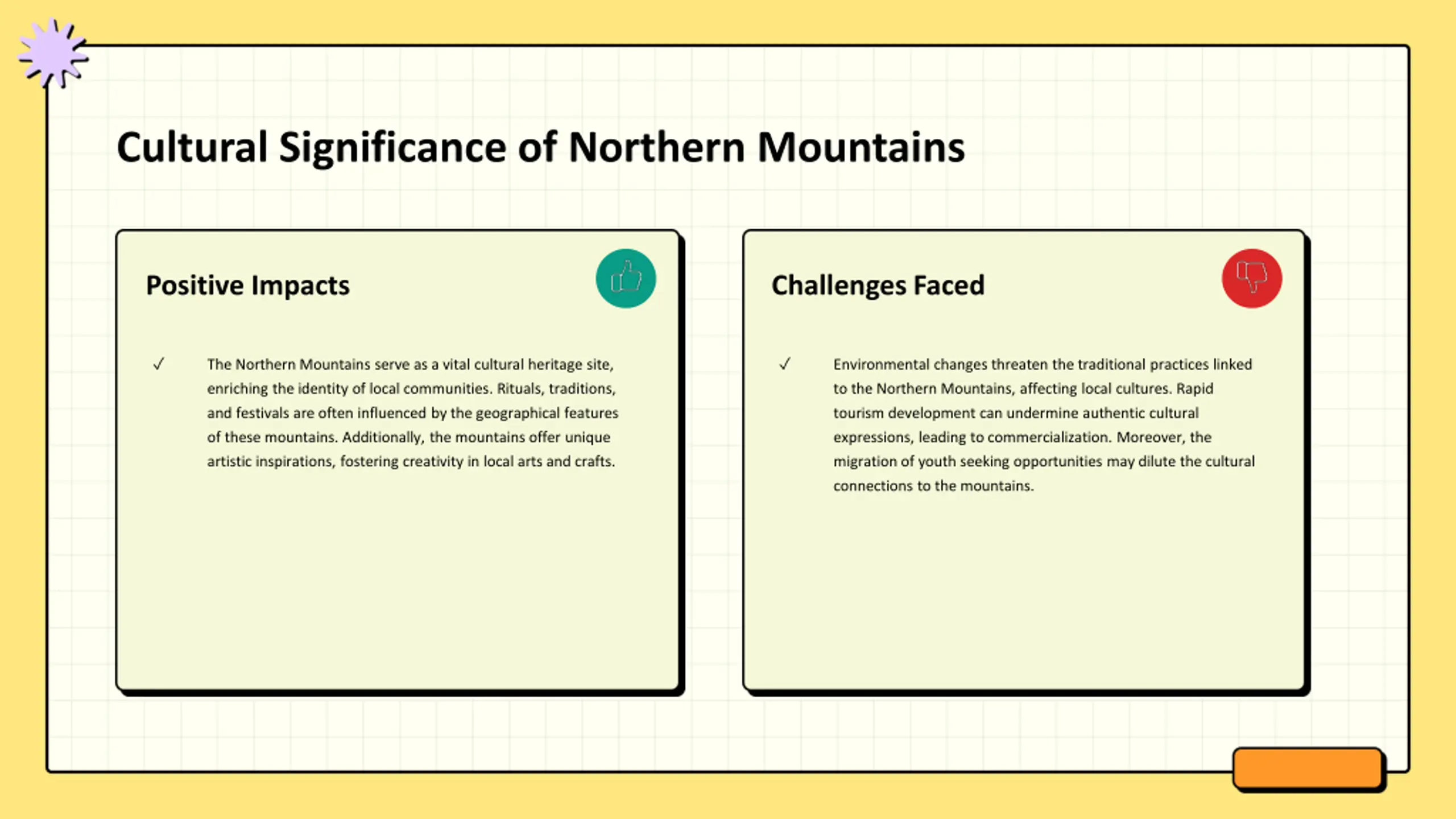 Cultural Significance of Northern Mountains Positive Impacts Challenges Faced The Northern Mountains serve as a vital cultural heritage site, enriching the identity of local communities. Rituals, traditions, and festivals are often influenced by the geographical features of these mountains. Additionally, the mountains offer unique artistic inspirations, fostering creativity in local arts and crafts. Environmental changes threaten the traditional practices linked to the Northern Mountains, affecting local cultures. Rapid tourism development can undermine authentic cultural expressions, leading to commercialization. Moreover, the migration of youth seeking opportunities may dilute the cultural connections to the mountains.
