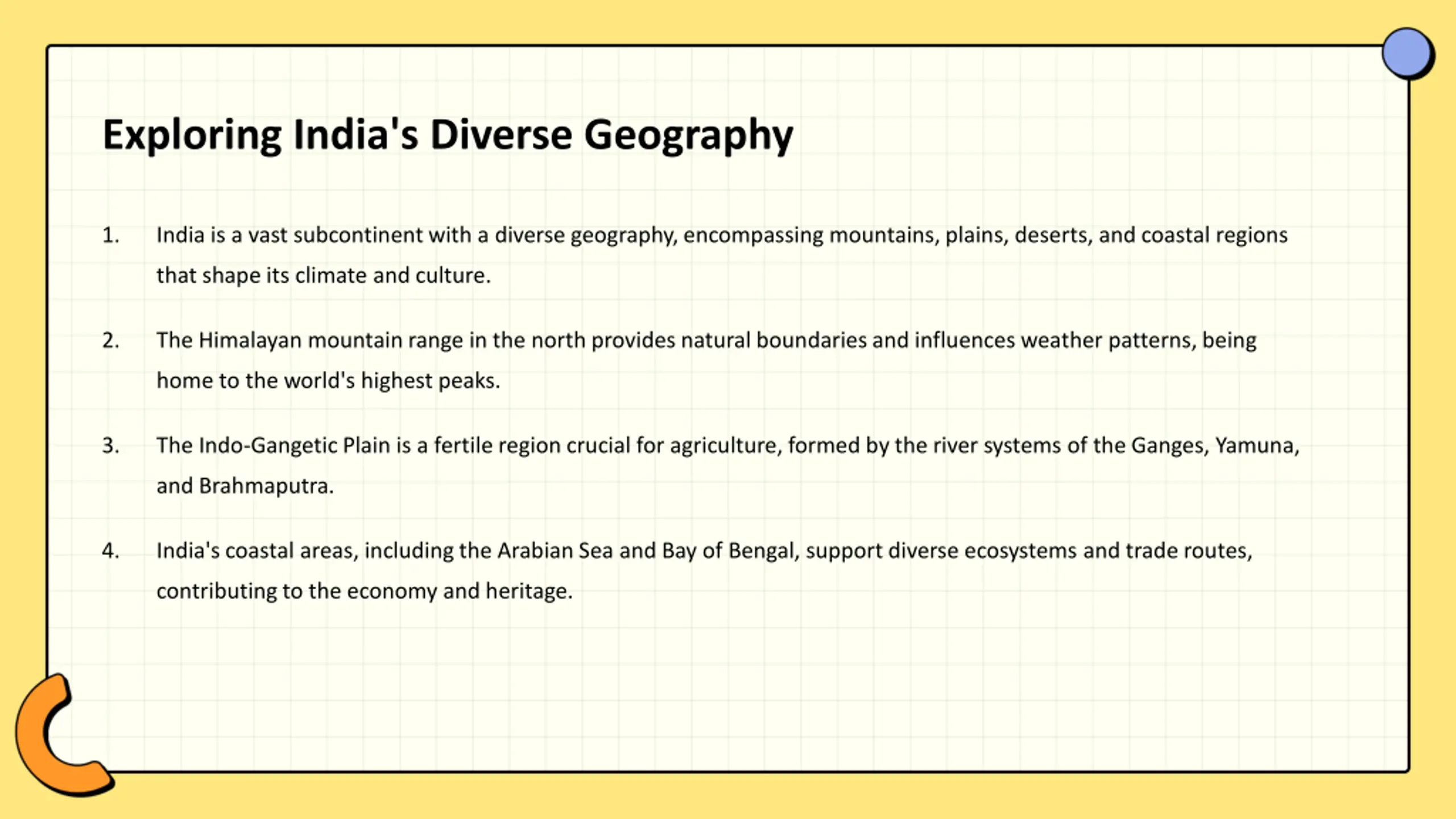Exploring India's Diverse Geography 1. India is a vast subcontinent with a diverse geography, encompassing mountains, plains, deserts, and coastal regions that shape its climate and culture. 2. The Himalayan mountain range in the north provides natural boundaries and influences weather patterns, being home to the world's highest peaks. 3. The Indo-Gangetic Plain is a fertile region crucial for agriculture, formed by the river systems of the Ganges, Yamuna, and Brahmaputra. 4. India's coastal areas, including the Arabian Sea and Bay of Bengal, support diverse ecosystems and trade routes, contributing to the economy and heritage.
