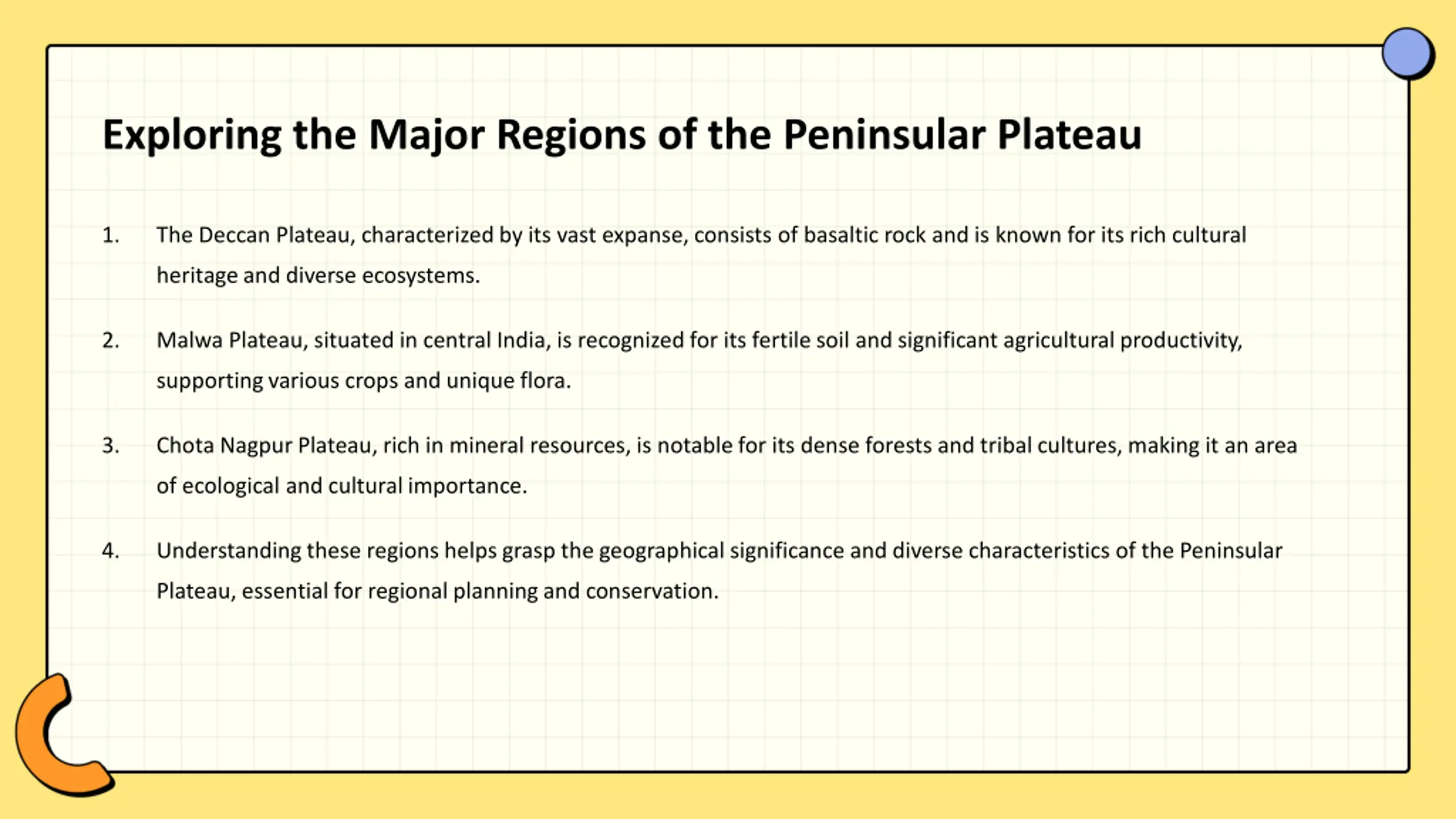Exploring the Major Regions of the Peninsular Plateau 1. The Deccan Plateau, characterized by its vast expanse, consists of basaltic rock and is known for its rich cultural heritage and diverse ecosystems. 2. Malwa Plateau, situated in central India, is recognized for its fertile soil and significant agricultural productivity, supporting various crops and unique flora. 3. Chota Nagpur Plateau, rich in mineral resources, is notable for its dense forests and tribal cultures, making it an area of ecological and cultural importance. 4. Understanding these regions helps grasp the geographical significance and diverse characteristics of the Peninsular Plateau, essential for regional planning and conservation.