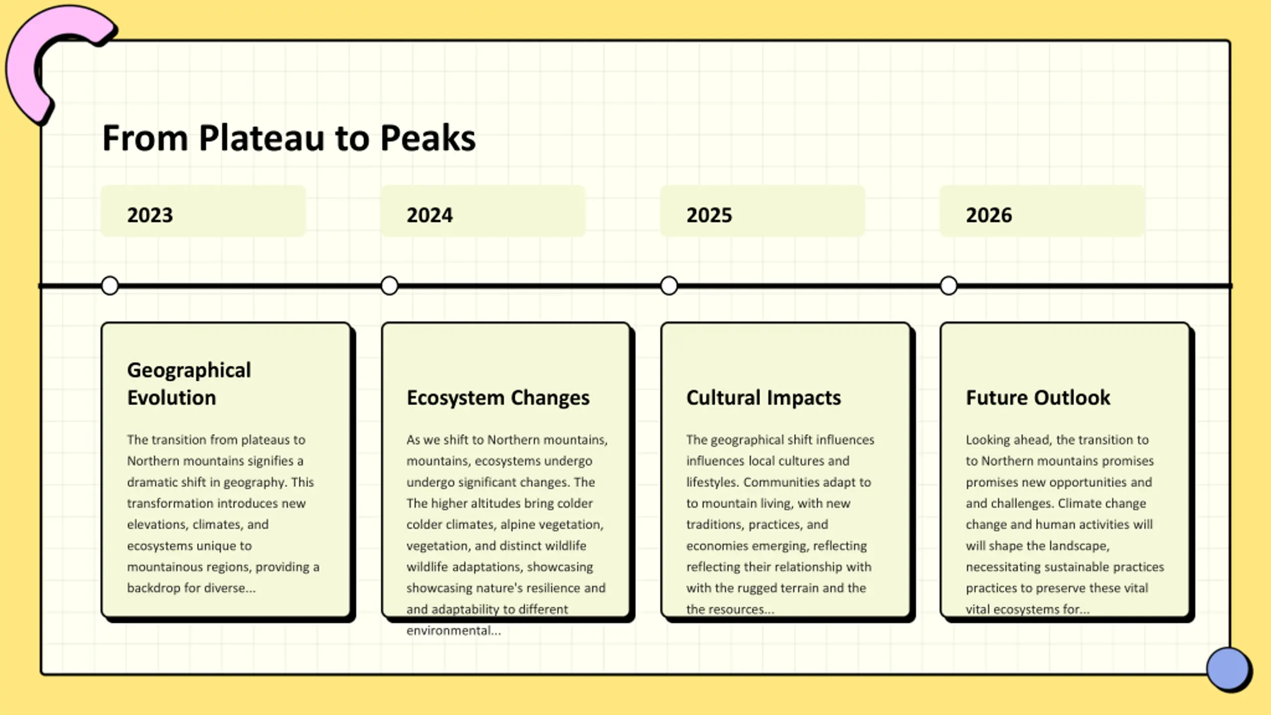 From Plateau to Peaks 2025 2026 2023 2024 Geographical Evolution Ecosystem Changes Cultural Impacts Future Outlook The transition from plateaus to Northern mountains signifies a dramatic shift in geography. This transformation introduces new elevations, climates, and ecosystems unique to mountainous regions, providing a backdrop for diverse... As we shift to Northern mountains, mountains, ecosystems undergo undergo significant changes. The The higher altitudes bring colder colder climates, alpine vegetation, vegetation, and distinct wildlife wildlife adaptations, showcasing showcasing nature's resilience and and adaptability to different environmental... The geographical shift influences influences local cultures and lifestyles. Communities adapt to to mountain living, with new traditions, practices, and economies emerging, reflecting reflecting their relationship with with the rugged terrain and the the resources... Looking ahead, the transition to to Northern mountains promises promises new opportunities and and challenges. Climate change change and human activities will will shape the landscape, necessitating sustainable practices practices to preserve these vital vital ecosystems for...
