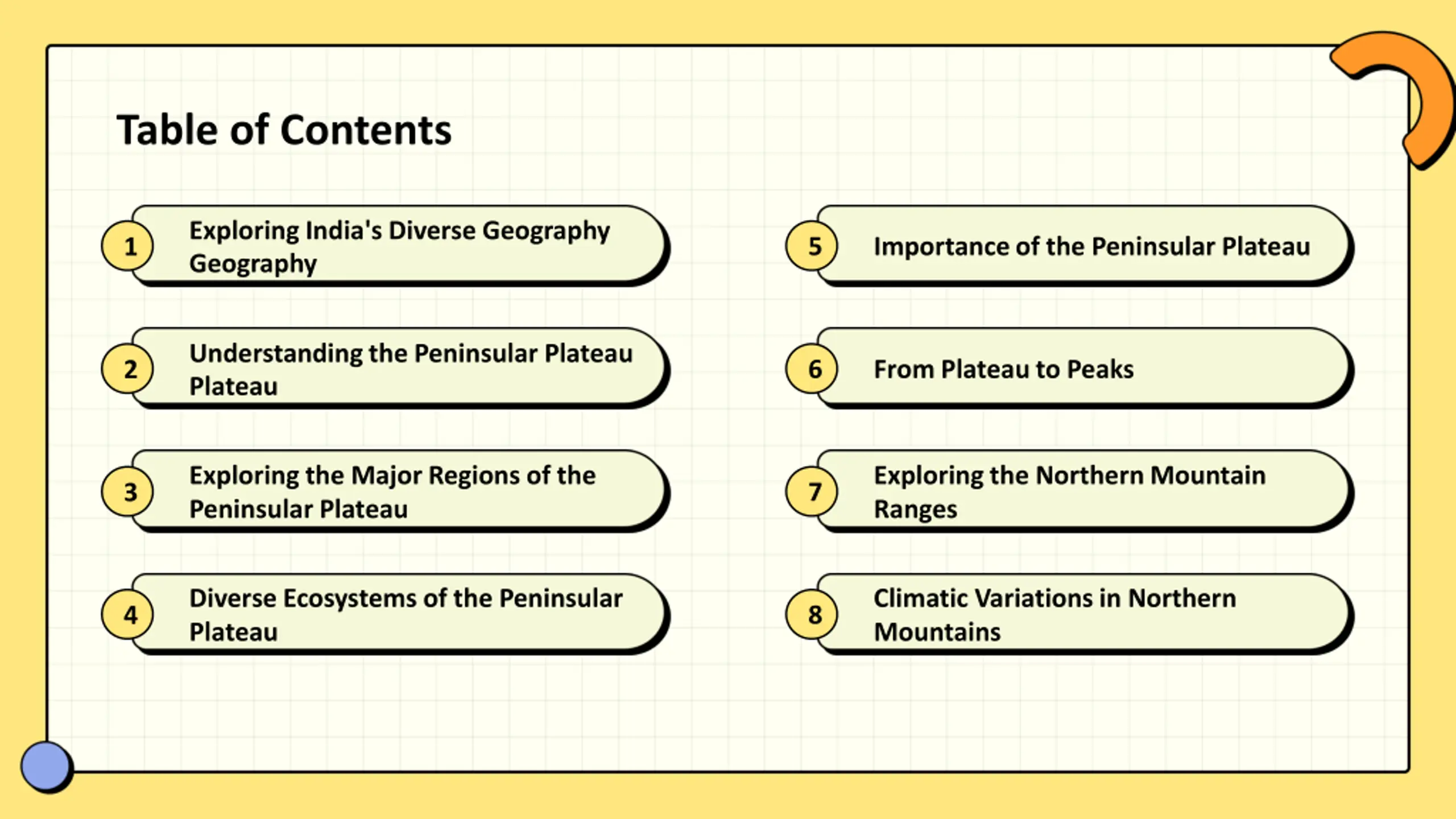 Table of Contents Exploring India's Diverse Geography Geography 5 Importance of the Peninsular Plateau 1 Understanding the Peninsular Plateau Plateau 6 From Plateau to Peaks 2 Exploring the Major Regions of the Peninsular Plateau Exploring the Northern Mountain Ranges 7 3 Diverse Ecosystems of the Peninsular Plateau Climatic Variations in Northern Mountains 8 4
