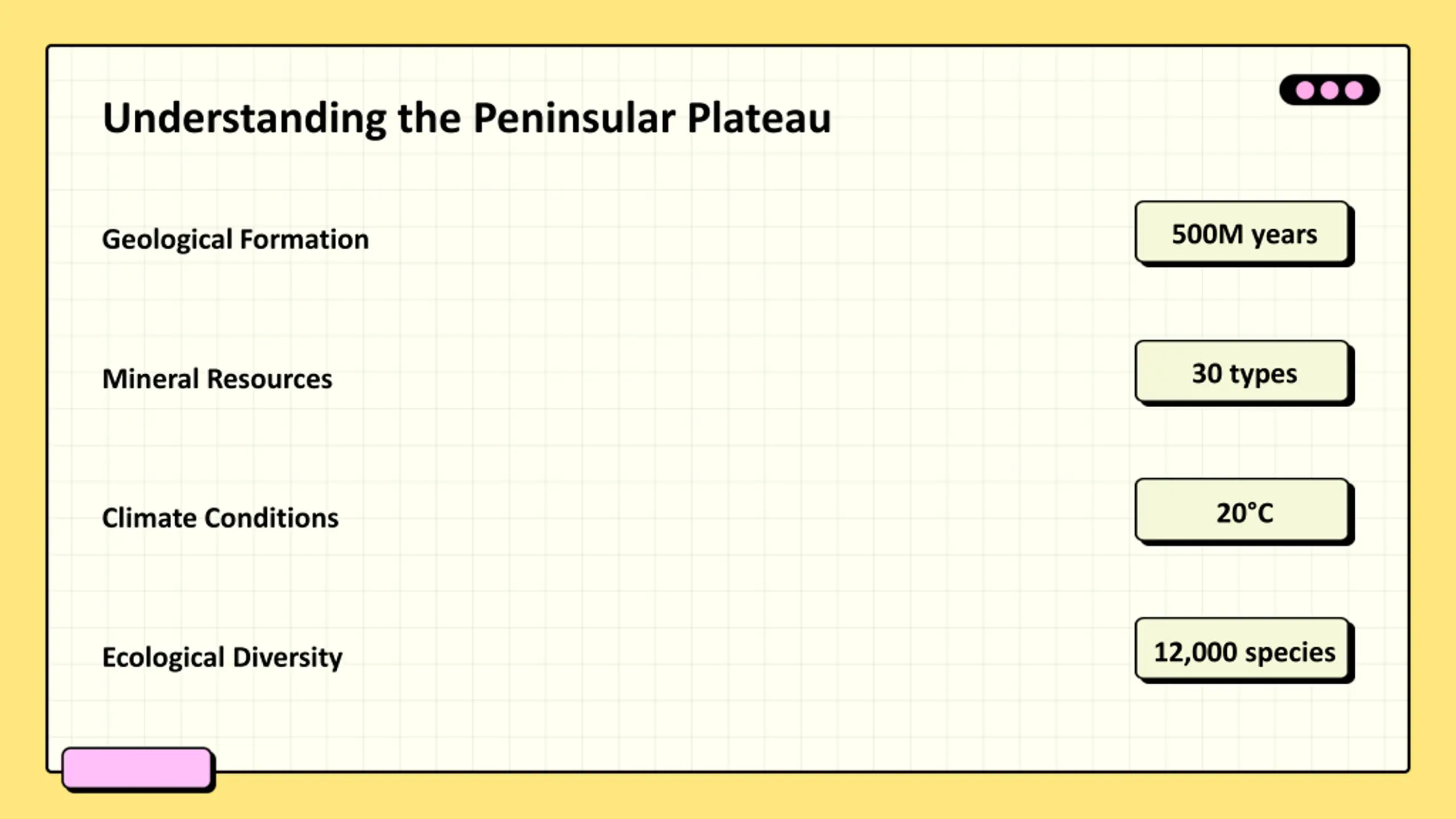 Understanding the Peninsular Plateau 500M years Geological Formation 30 types Mineral Resources 20 C Climate Conditions 12,000 species Ecological Diversity