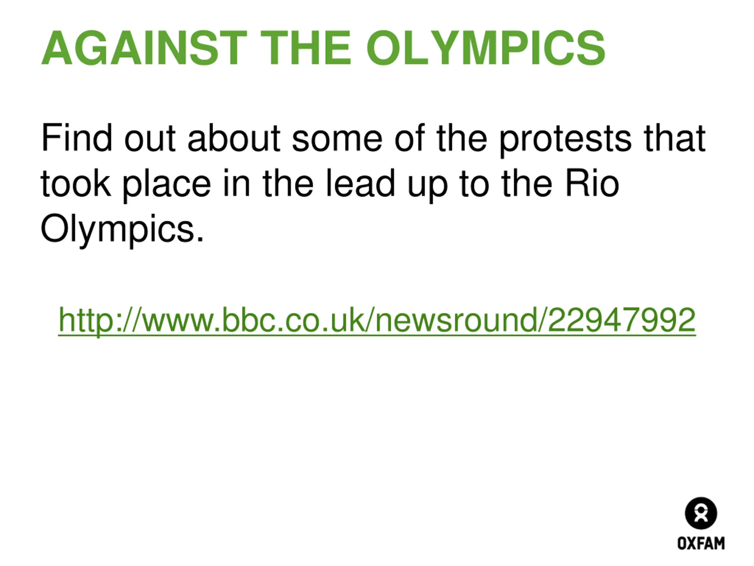 AGAINST THE OLYMPICS Find out about some of the protests that took place in the lead up to the Rio Olympics. http://www.bbc.co.uk/newsround/22947992
