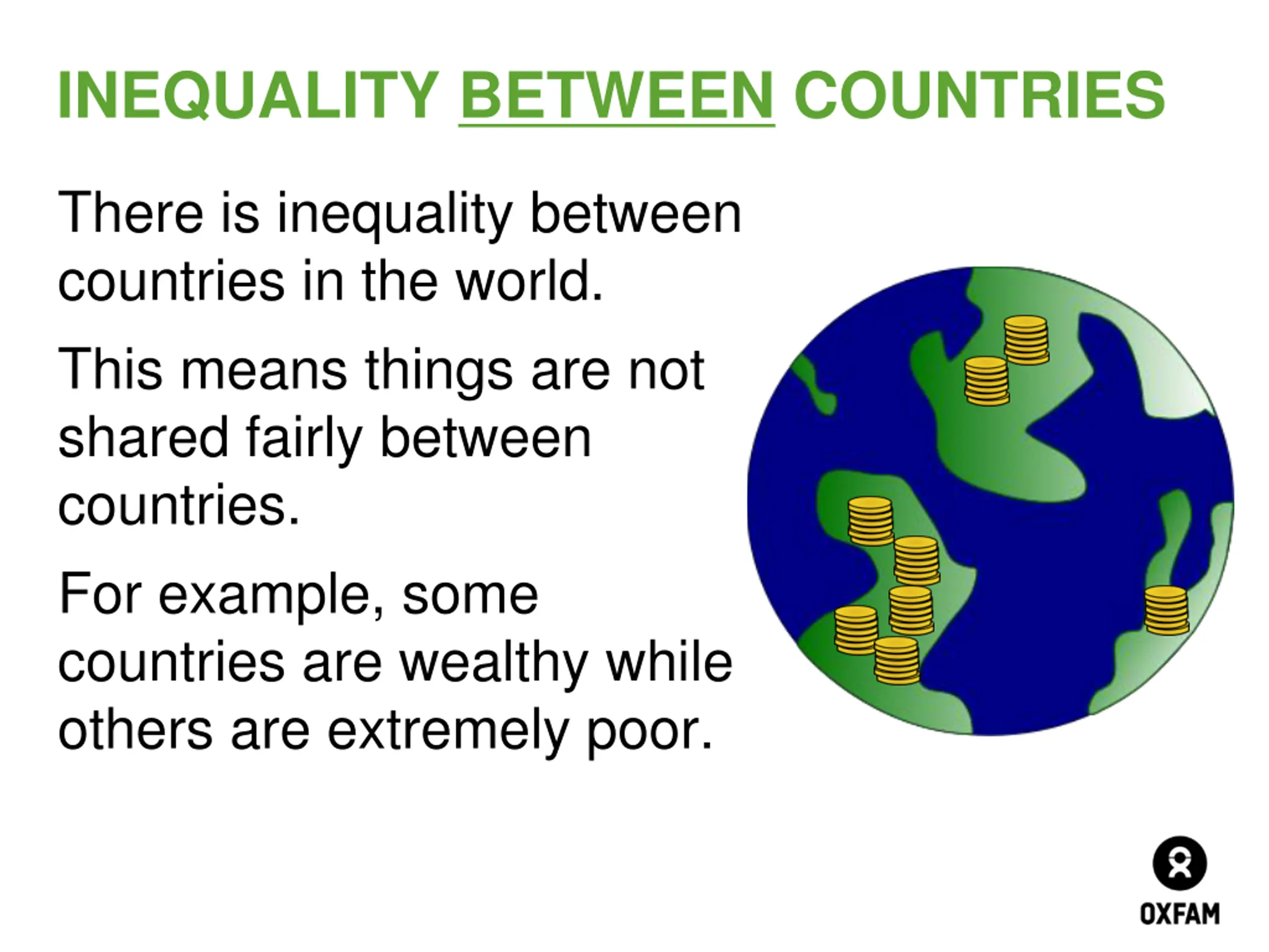 INEQUALITY BETWEEN COUNTRIES There is inequality between countries in the world. This means things are not shared fairly between countries. For example, some countries are wealthy while others are extremely poor.